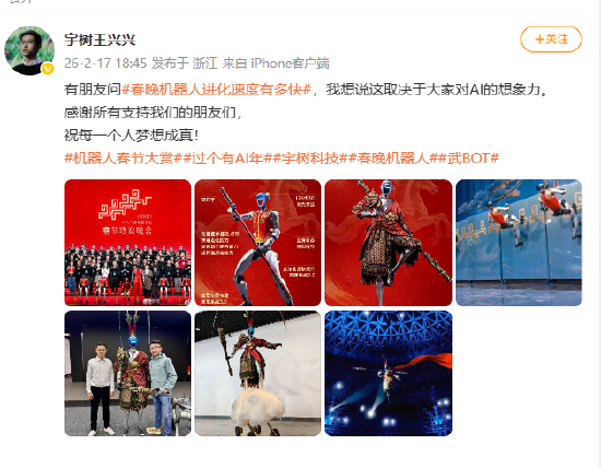 2月17日大年初一,宇树科技王兴兴发微博称,有朋友问#春晚机器人进化速度有多快#,我想说这取决于大家对AI的想象力。感谢所有支持我们的朋友们,祝每一个人梦想成真!