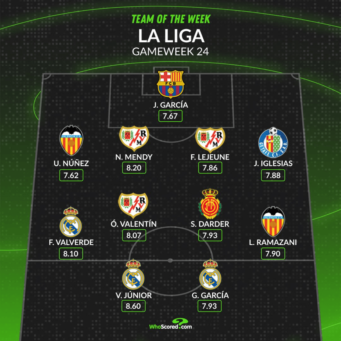 后卫:乌奈-努涅斯(瓦伦西亚)、门迪(巴列卡诺)、勒热纳(巴列卡诺)、伊格莱西亚斯(赫塔菲)
