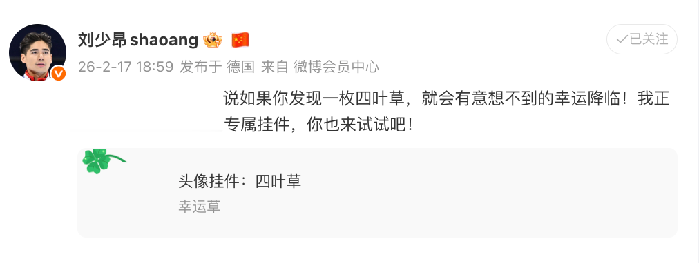 虎扑02月17日讯中国短道速滑选手刘少昂把微博头像挂件换成了“四叶草”,并带上“求好运”等话题,引发网友热议。