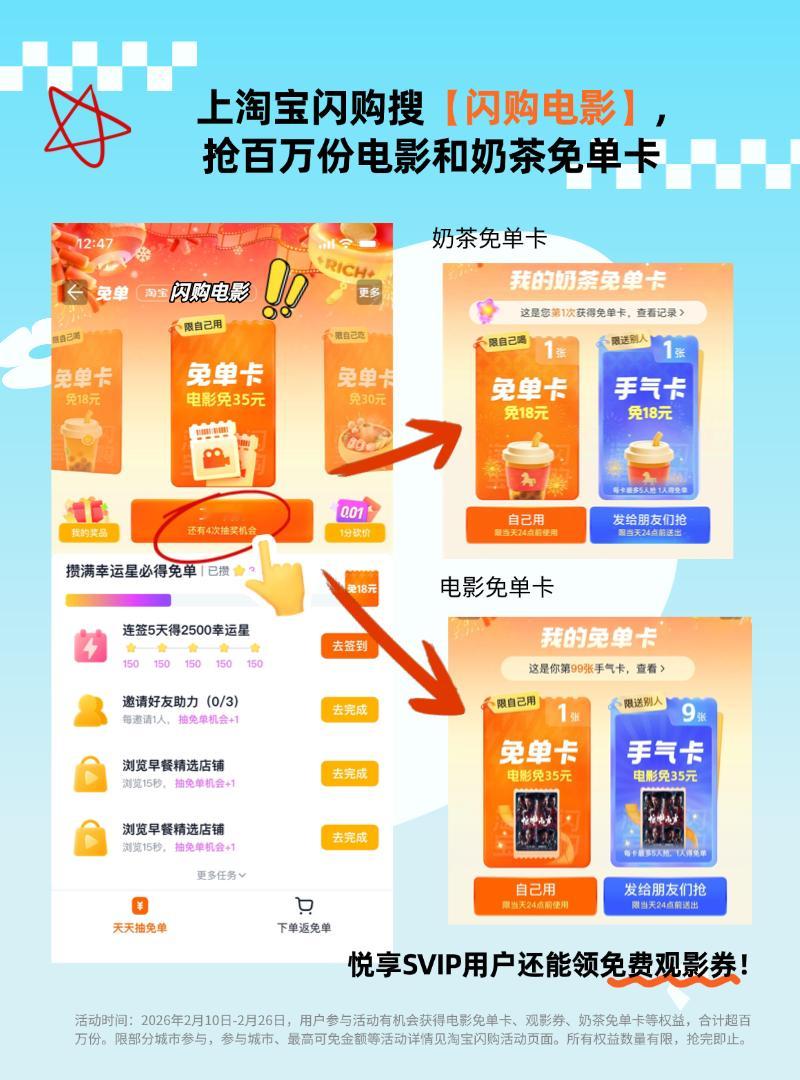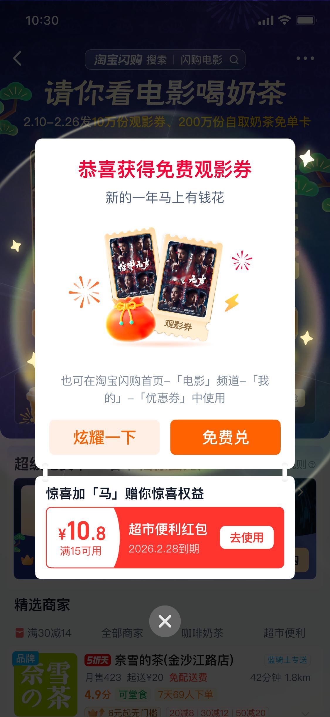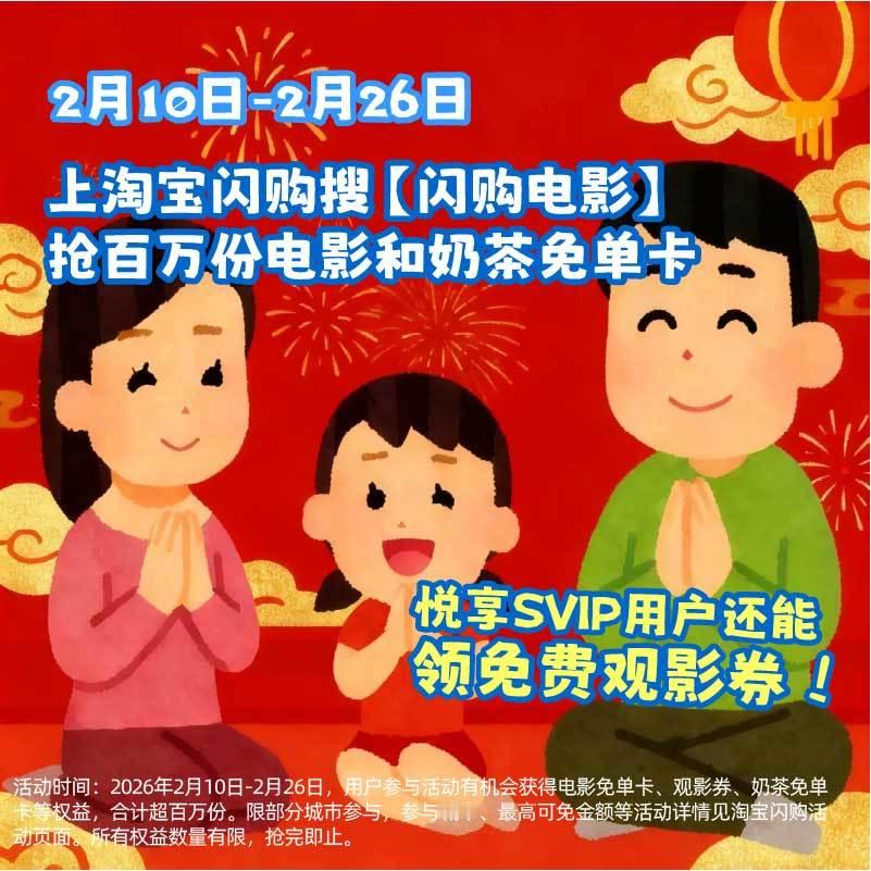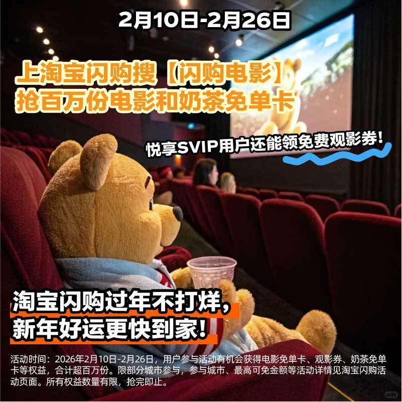 马年咱也是出息了,大年初一的直接享受上了包场看《惊蛰无声》的权益!过年上淘宝闪购抢电影奶茶免单没想到本尊贵的悦享SVIP用户权益都多到这方面了!春节淘宝闪购请你看电影喝奶茶,2月10日-2月26日,上淘宝闪购搜【闪购电影】,抢百万份电影和奶茶免单卡,悦享SVIP用户还能领免费观影券,享受包场权益!淘宝闪购过年不打烊,新年好运更快到家!淘宝闪购过年不打烊,这不打烊的福气我接咯~