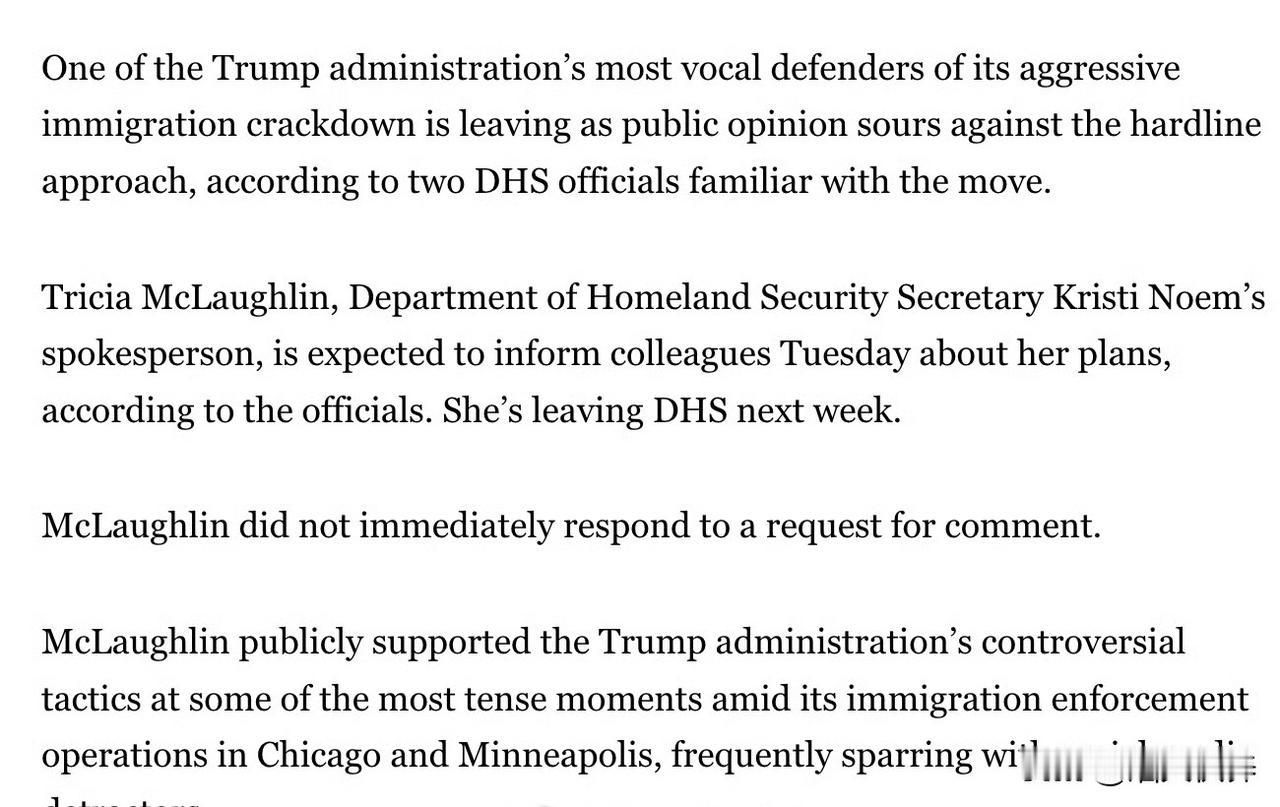 为美国国土安全部挡子弹的发言人Tricia McLaughlin准备离职。