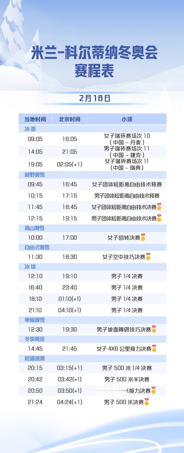 最新赛程女子空中技巧:17时预赛第一轮,17时45分预赛第二轮,20时决赛第一轮,21时决赛第二轮;单板滑雪男子坡面障碍技巧决赛:18时20分第一轮,18时48分第二轮,19时16分第三轮