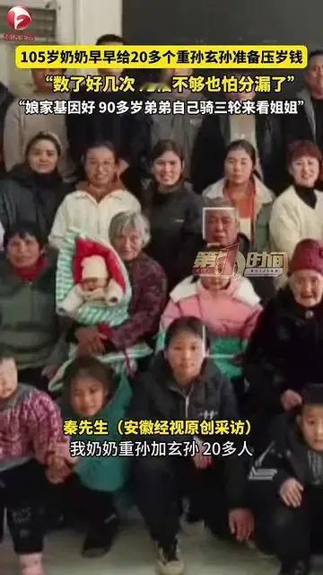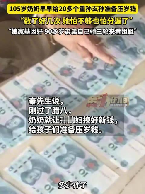 105岁奶奶为何夜不能寐,只为给20多个重孙玄孙发压岁钱? 在中国河南滑县,一位105岁的奶奶早早为20多个重孙、玄孙准备压岁钱,这一举动在当地引起了关注。腊八刚过,这位老奶奶便让家人换好新钱,反复清点,生怕分漏或备不足,直至深夜仍不敢安眠,担心钱被拿走。家人表示,老人娘家基因好,如今眼不花耳不聋、思路清晰,其90多岁的弟弟也每年骑三轮车来看望她。这种令人敬佩的精神状态不仅让人感叹,也展现了家族之间的深厚情感和传统美德的传承。 百岁老人过年 高龄红包 拜岁红包 河北压岁钱