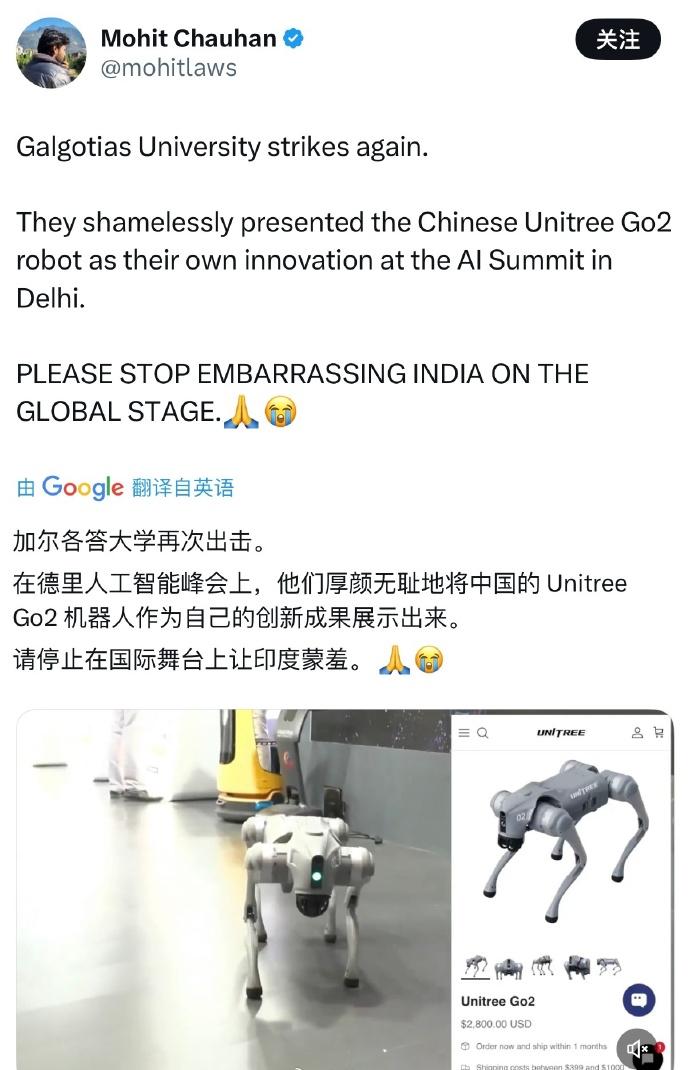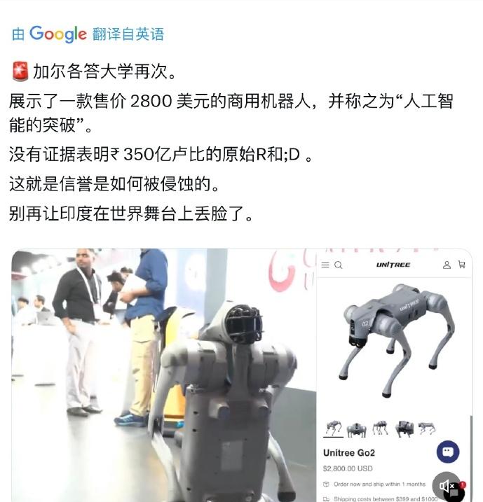 印度人工智能峰会350亿卢比“研发”的机器人是买中国的,就花了2800美金,这脸打的太尴尬了! 2月16日,印度人工智能影响峰会在新德里开幕, 加尔各答斯大学在展台上高调展示了四足机器人 “ORION”, 校方代表称这是投入350亿卢比(约 28.6 亿人民币)、集结顶尖力量自研的成果, 可用于监控巡逻,是 “印度AI生态核心”。 结果当天就被网友当场拆穿, 这台 “ORION” 与中国宇树科技的Go2机器狗外观、步态完全一致, 官网明码标价才2800美元(约2.5万印度卢比),是公开售卖的消费级产品,没有任何自研改造痕迹。 2.5万卢比的商品被吹成350亿卢比的研发成果,差价高达140万倍, 相关质疑视频迅速在社交媒体发酵,印度网友怒批丢脸丢到全世界。 2月18日,加尔各答斯大学发布声明改口, 称机器人是 “从中国采购的学术学习工具,从未声称自研”。 但网友扒出此前该校宣传海报、现场教授采访都明确标注 “本土研发”,谎言不攻自破。 印度网友怒批 “贪腐明目张胆”“丢尽国家颜面”,要求彻查350亿卢比经费去哪了? 峰会上来了全球科技企业,这事儿也太尴尬了! 印度要解决的可能还不是AI研发问题, 还是先把“懂礼仪,知廉耻”从头学起来吧!