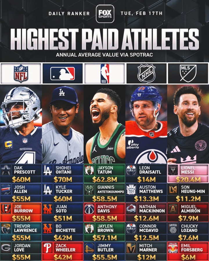 直播吧02月18日讯FOX体育统计了全美五大联盟的TOP5薪资,大谷翔平全美最高7000万美元,梅西2040万美元,塔图姆6280万美元。