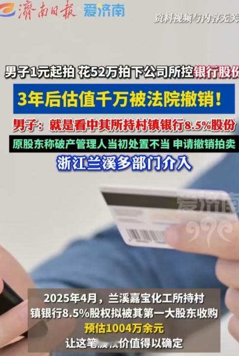 浙江,一公司破产,股权一元起拍,男子以52万元拿下全部股权。不料三年后得知,股权中8.5%的村镇银行股份估值超千万,可这份“天降红利”竟被法院裁定收回,原利害关系人起诉获支持,男子怒而维权,多方已介入调查。 三年前,公司经营不善、资不抵债,被法院宣布破产,股权一元起拍,仿佛一个“烂摊子”,引来无数投资者围观。 那天上午,钱先生走进拍卖大厅时,空气里弥漫着紧张与兴奋的气息。15位竞拍者环绕一室,每个人的目光都炯炯有神,心里盘算着出价策略。 拍卖开始了,标价一轮轮攀升,仿佛每一次敲槌都敲在人的心口上。 有人悄悄退场,有人心有余悸,但钱先生稳如磐石,他心里有数:机会只有一次,不可错过。最终,经过数轮激烈竞价,他以52万元的价格,拿下了嘉宝化工全部股权。 随后,钱先生开始了系统的接管与清理。嘉宝化工的账目、资产、债务,他一一梳理。 经过专业团队评估,尤其是银行股份的潜在价值被逐步揭示出来——原来,这家被认为“毫无价值”的公司中,竟然持有价值可观的银行股份。 三年时间过去,这部分银行股份经过市场运作和评估,价值已超过1004万元,相当于他当初出价的近20倍。对于钱先生而言,这不仅是一笔意外之财,更是他精明投资的最好回报。 天有不测风云。正当钱先生准备进一步拓展业务时,一个意外的法律诉讼打破了他的宁静。 嘉宝化工原股东的关联方徐先生突然现身,将相关方告上法院,理由让钱先生几乎无法置信: 三年前破产管理人在处置股权时,未对银行股份开展正规评估,程序上存在瑕疵,导致股权“贱卖”,侵害了原股东合法权益。徐先生请求法院撤销那场司法拍卖,要求钱先生交还股权。 面对突如其来的诉讼,钱先生心中充满了愤怒与不解。 他找到记者,语气里带着明显的激动:“凭啥?挣钱了就要撤销,要是赔钱呢?如果那时候我拍了个烂摊子,血本无归,难道原股东也会跑出来说拍卖不公平? 这事放到市场上,公平交易的原则在哪里?拍卖明明是依法进行,我遵守了规则,为什么要被追责?” 他握紧手机,反复浏览拍卖当日的记录和文件,眉头紧锁,仿佛每一页纸上都刻着他心中的不平。 钱先生说得毫不掩饰,他不仅是为自己利益争取,更是为司法程序的严肃性发声:“整个过程公开透明,有竞拍记录、有公示,有评估,有法院监督。 每一个参与竞拍的人都是自愿、明知风险。我投入的52万,是风险也是判断,如果市场不如预期,我可能一分钱不值。 可现在,事情突然反过来,说我占了便宜,这公平吗?如果我是亏了,还会有人帮我申诉吗?”他的语气带着明显的焦灼,眼神中夹杂着不甘与愤怒。 事件曝光后,在网络上引发了轩然大波。 网友们分为两派,一派支持钱先生,认为这是典型的“事后诸葛亮”,一边倒地批评原股东及其关联方:“拍卖当时大家都知道风险,你自己没出价,现在凭什么反悔?” 另一派则对法院的判决表示认可,认为程序瑕疵不可忽视,必须保障原股东的合法权益:“不管市场后来涨了多少,程序上的正义要先行。” 社交媒体上,各种评论铺天盖地。有人调侃:“钱先生这是天上掉馅饼,结果馅饼又被收回。” 有人分析道:“这说明司法拍卖不仅是财富游戏,也是法律规则的考验。”也有人提出深度思考:“如果利润可以被追回,那风险也应该被平等对待,这才公平。” 网络讨论持续升温,从财经板块延伸到法律、社会观察,各类评论形成了强烈的舆论潮。 面对舆论的喧嚣,钱先生依然坚持维权。他联系了律师团队,准备通过法律途径提出上诉,同时呼吁社会关注司法拍卖中的规则透明和程序正义。 他不止一次对记者说:“我不是贪财的人,我只是遵守规则做生意的人。 我理解保护原股东权益的重要性,但不能因为后来的市场变化,就改变当初合法的交易结果。这是对每一个投资者、每一笔合法交易的信任问题。”