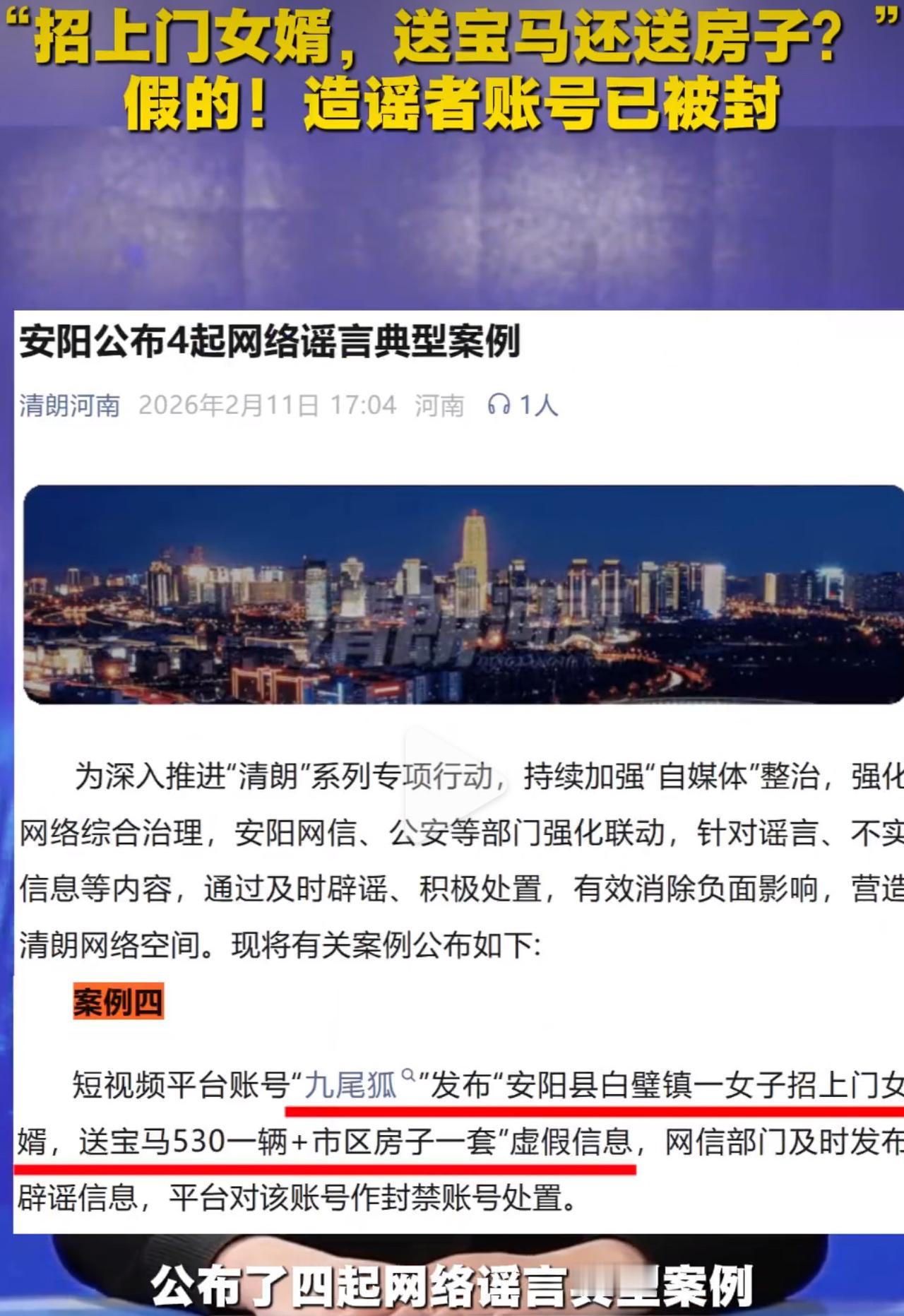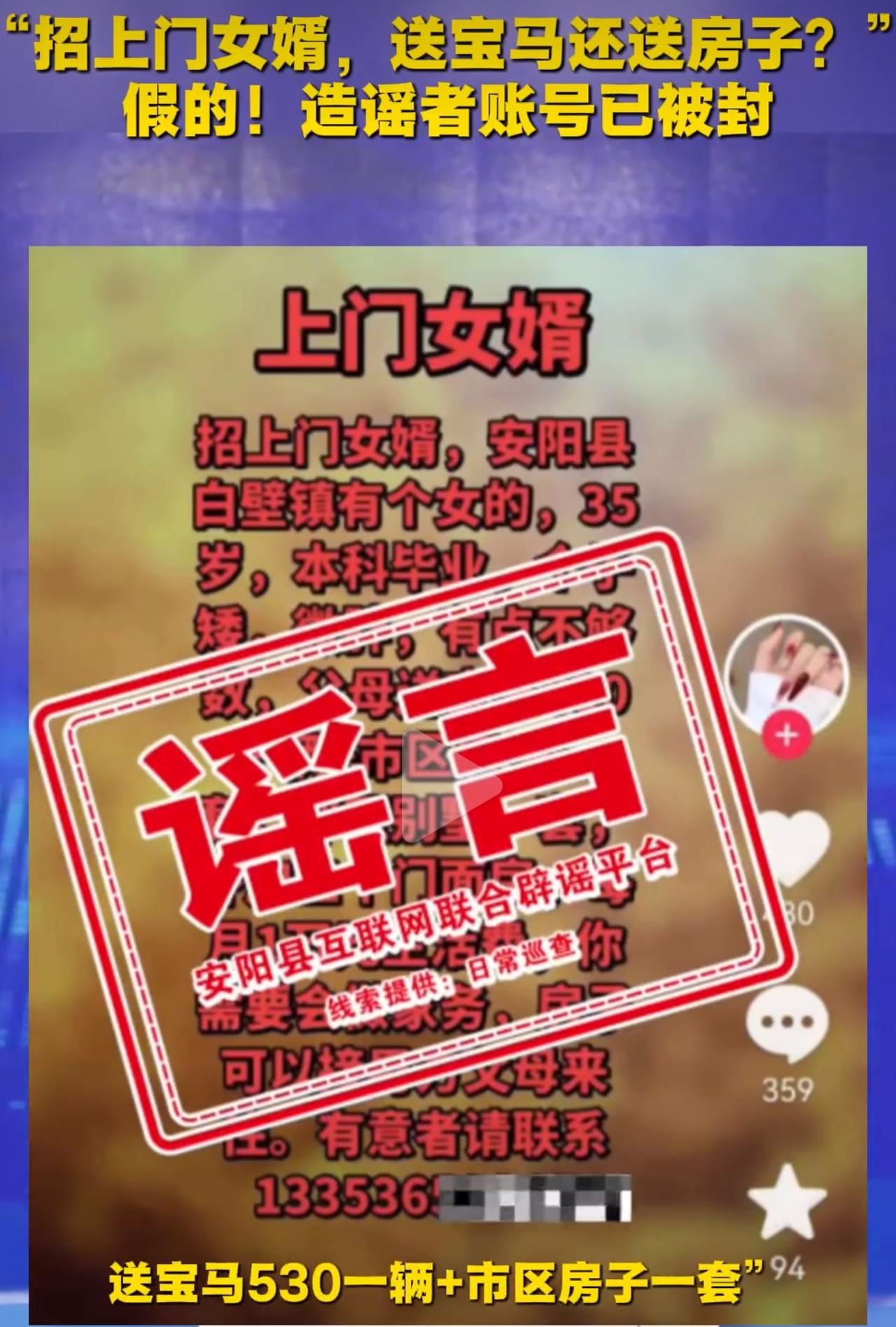 2月7号,网上突然疯传安阳白璧镇有个女生招上门女婿,条件开得特别诱人,宝马530、市区房子直接送,好多人一看就心动了,到处打听真假。 可谁能想到,这从头到尾就是假的,完全是有人为了博流量瞎编乱造,甚至还盗用了别人的手机号码。 手机号的主人无辜躺枪,天天被各种陌生电话骚扰,正常生活全被搅乱,换谁心里都又气又委屈。 官方很快就查清了事实,直接把造谣的账号“九尾狐”永久封禁,这件事也被当成典型案例公开处理。 其实这种重金招婿的谣言早就不是第一次出现了,无非就是抓住大家贪便宜的心理博眼球。 真的特别不理解,为了那点流量编造谎言,连累无辜的人,实在太过分。 网络真不是可以随便造谣的地方,乱说一定会付出代价。 以后再看到这种好得离谱的消息,大家一定多留个心眼,别轻易相信,更别跟着乱传。上门女婿招亲 安阳 拒绝网络谣言