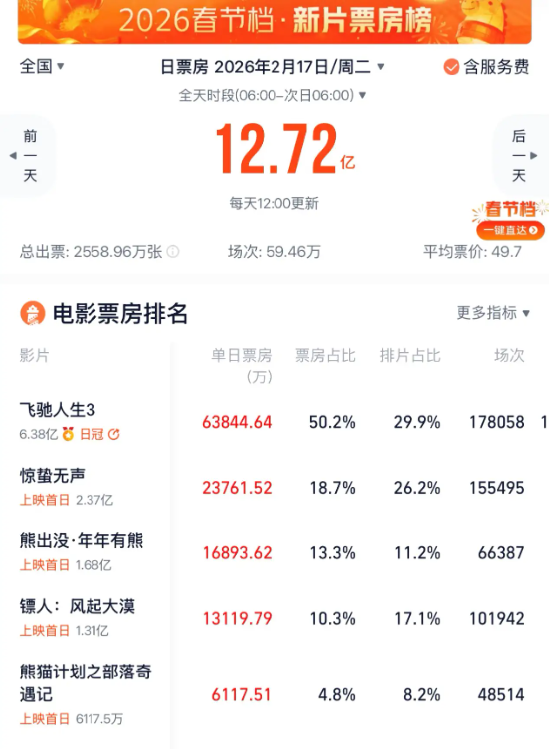 不过,场次的激增并未带动票房同步增长,反而出现大幅下滑。2026年大年初一首日票房为12.72亿元,而2025年同期票房达18.08亿元,同比下降超5亿元,降幅约30%。从历史维度来看,今年春节档首日票房跌至近年最低水平,仅高于2017年的8.06亿票房,相当于倒退至2018年12.77亿元的水平。