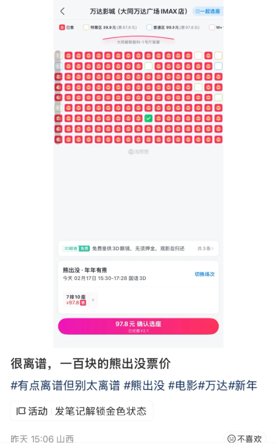 一位网友表示,“很离谱,熊出没票价要100块。”还有网友吐槽,“有点想看《惊蛰无声》,但过年小县城电影票涨到100元一张,抢钱呢。”