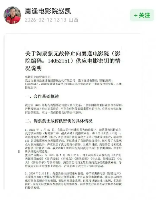 值得注意的是,山西襄逢影院与淘票票因《惊蛰无声》排片和密钥问题产生的纠纷,在节前引发行业关注。《BUG》栏目发现,多个平台上的控诉发文已不可见,影院相关工作人员表示目前已经拿到密钥,在淘票票App上可正常购买《惊蛰无声》电影票。
