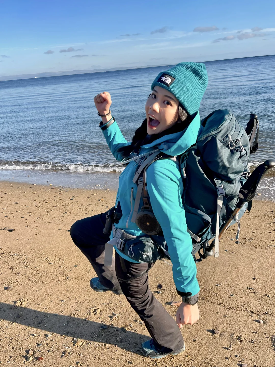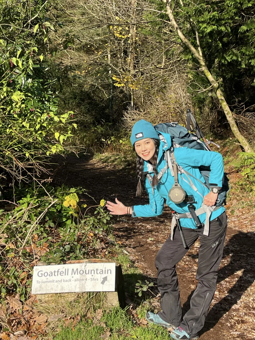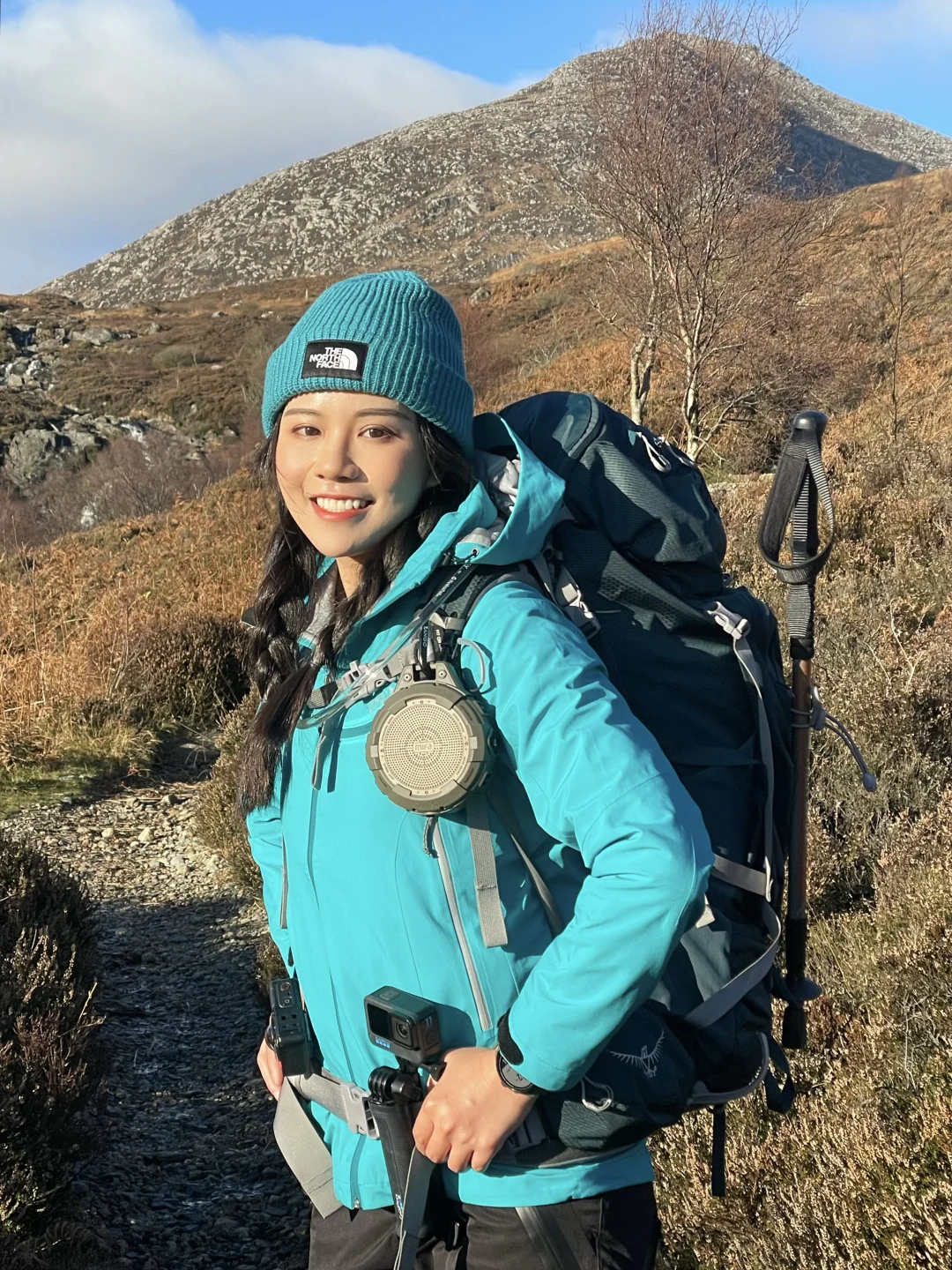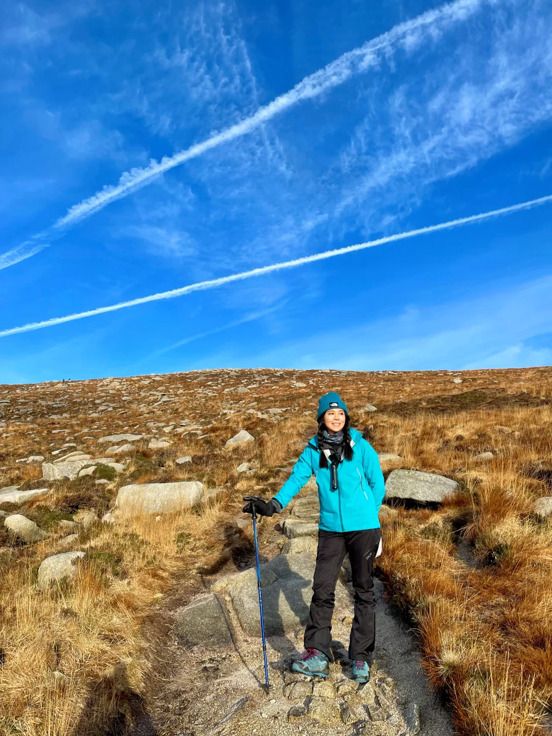 从Brodick下船后,沿着海岸线⾛向登⼭⼝,⼀侧是⼭,⼀侧是海。徒步前半段节奏舒缓,浪声和⻛声始终陪伴左右。随着⾼度上升,视野逐渐打开,回头能看到海湾在光线变化中呈现出不同层次的蓝⾊。这种“边⾛边被⻛景包围的感觉,让⼈不⾃觉地慢下来。