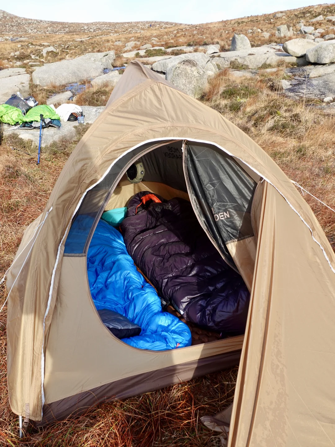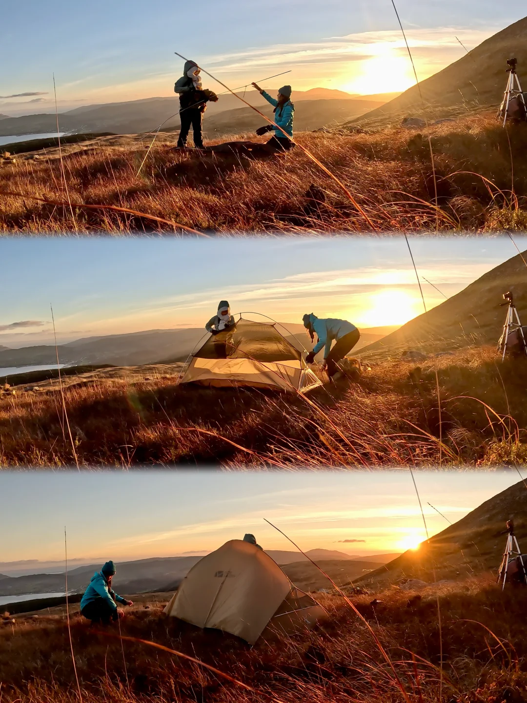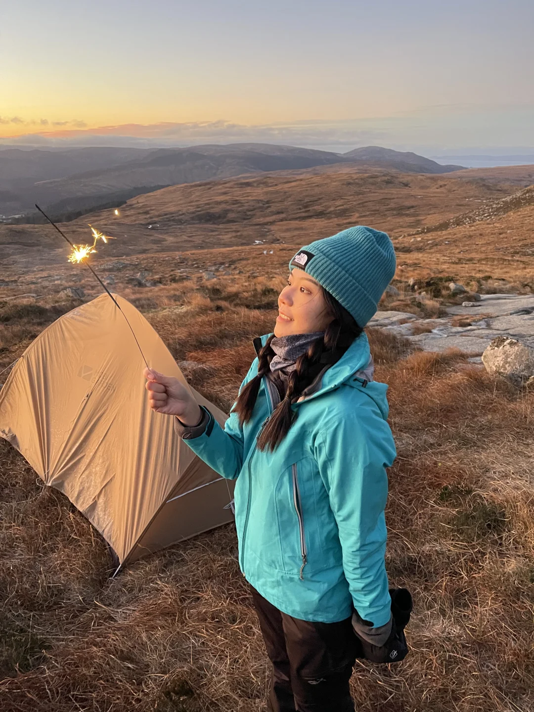 傍晚前,我在⼭腰找到⼀块相对平整的位置扎营。把帐篷搭好,铺开睡眠装备,烧⽔、热饭、煮⼀顿简单却温暖的晚餐。太阳缓缓落⼊海平⾯,温度下降,世界也随之安静下来。那⼀刻没有打卡、没有安排,只有⾃然按⾃⼰的节奏展开——这是我最清晰记住的⼀个苏格兰时刻。