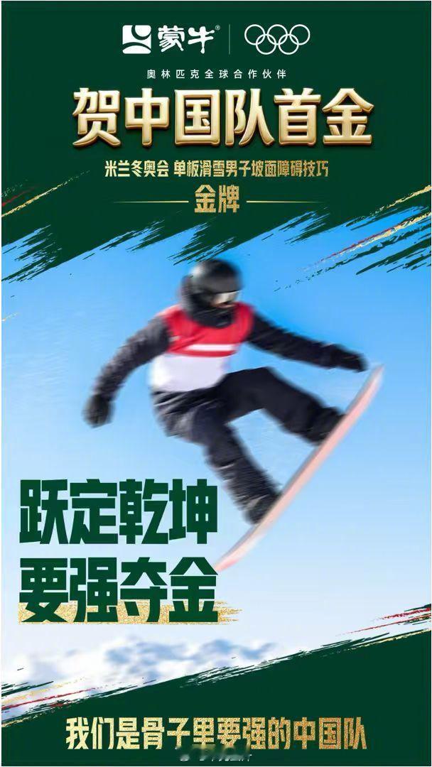 中国队赢了就是牛 蒙牛作为奥林匹克全球合作伙伴为中国队出征运动员提供营养保障,祝贺中国队在米兰冬奥会夺得首金。22岁的少年在生日这天加冕,苏翊鸣的未来是星辰大海!