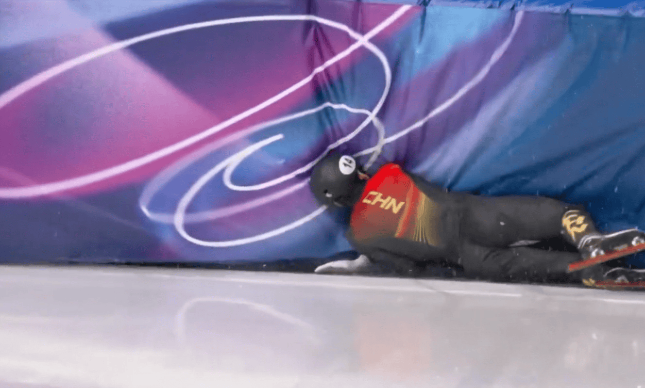 解说席上的任子威表示:“这个倾斜角度太大了,这也不是踩点了或者冰面的问题。大家可以看到这双冰鞋,也能看到短道速滑的倾斜角度——基本上就是差一点点就要贴冰了。”