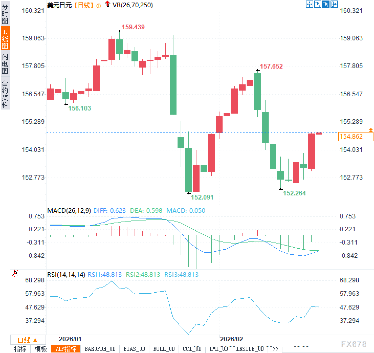 汇通财经APP讯——2月19日周四,美元兑日元欧洲时段交投154.80附近,陷入了区间震荡。回顾此前的走势,汇价曾上探至159.439的高位,随后却遭遇空头猛烈反扑,迅速跌破关键支撑并下探至152.091的低点。尽管多头曾试图组织反击将价格推回157.652附近,但上方抛压沉重,导致行情再度回落。