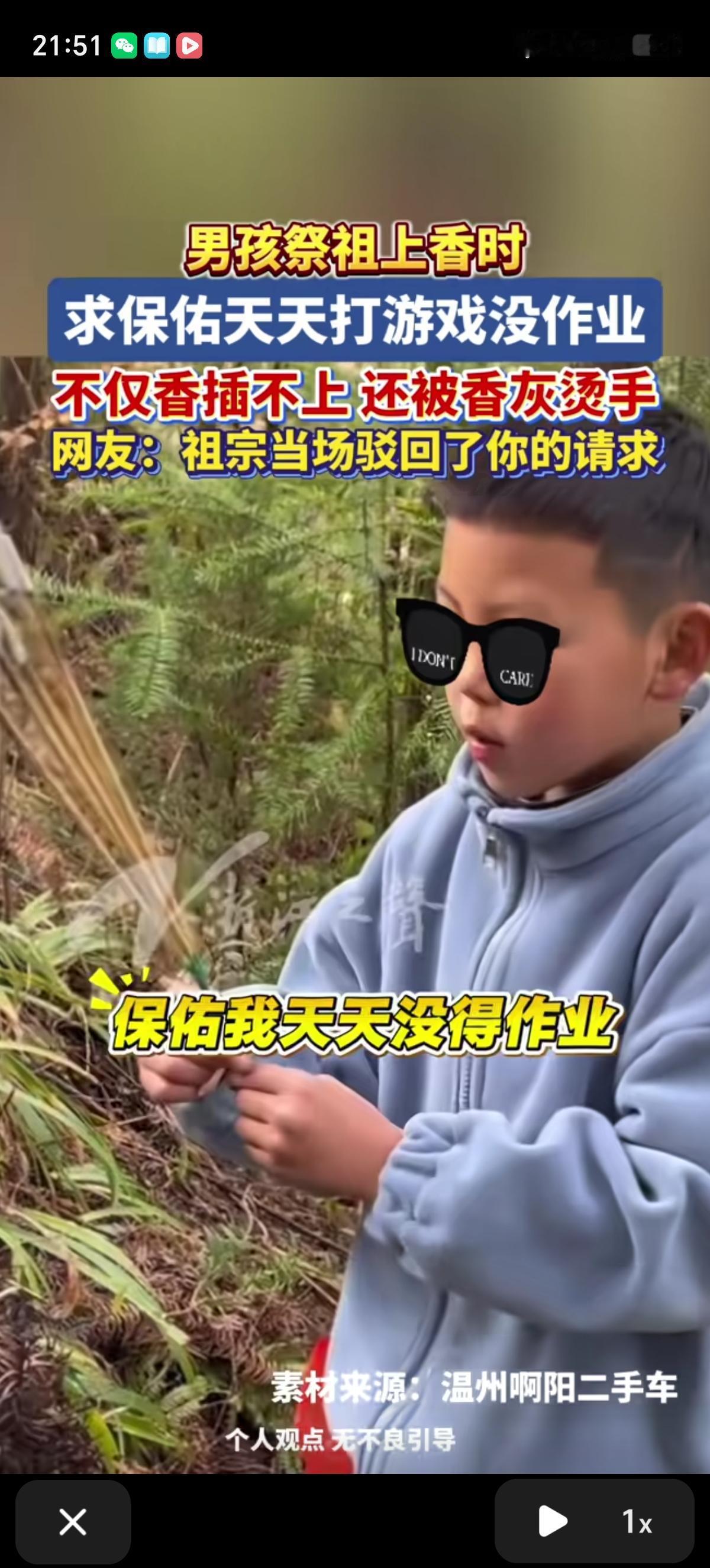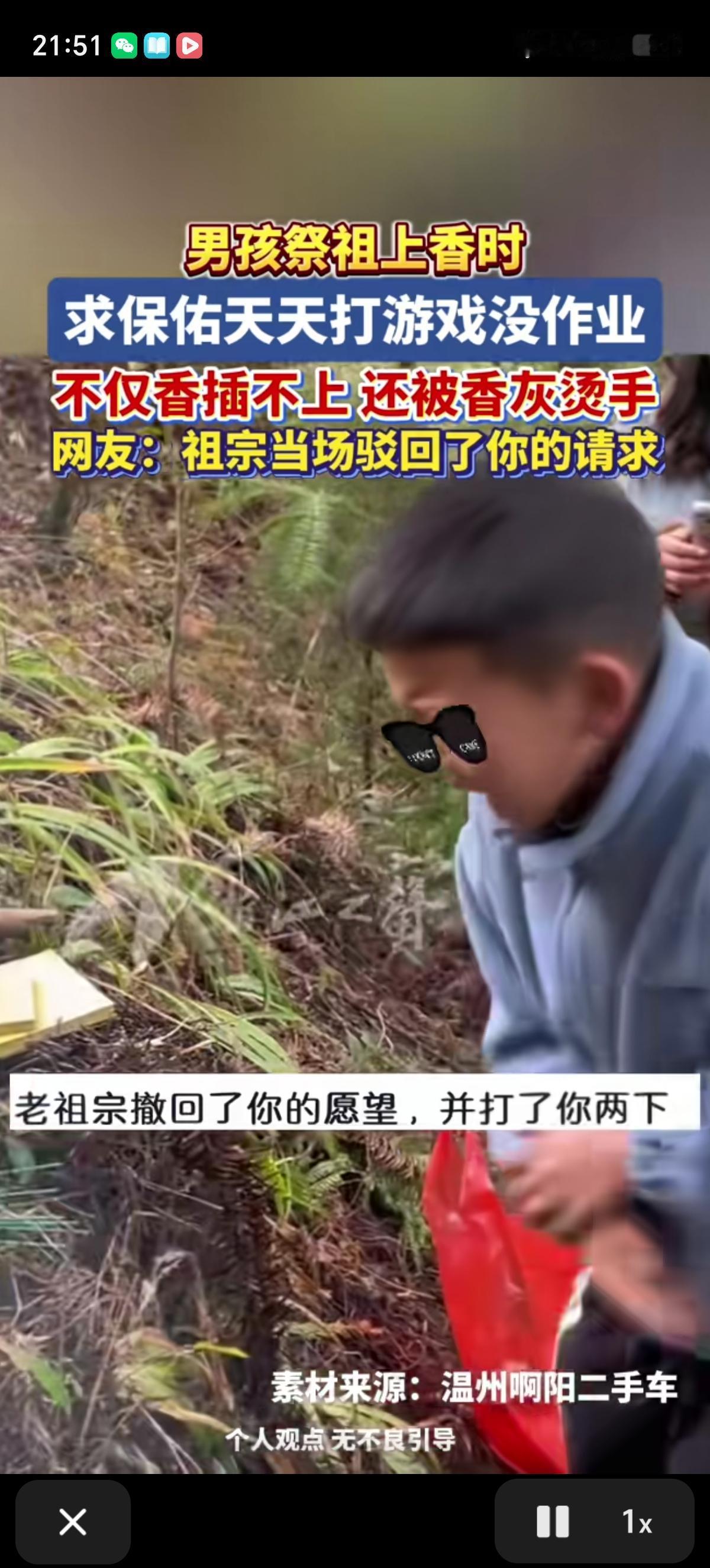 男孩祭祖上香跟老祖宗念叨:“保佑我打游戏每局VIP,保佑我天天打游戏,保佑我天天没得作业。”说完还十分虔诚的鞠了一躬。可惜老祖宗没同意。 男孩的香不但没插上去,还被香灰烫了手,明显愿望被老祖宗驳回了,还给了他一番爱的教育,让他拥有了一个完整的童年。[捂脸][捂脸][捂脸]