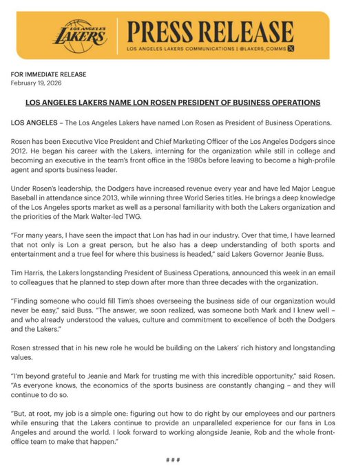 虎扑02月20日讯今日,湖人官方发布公告,宣布任命朗-罗森为商业运营总裁,公告全文如下: