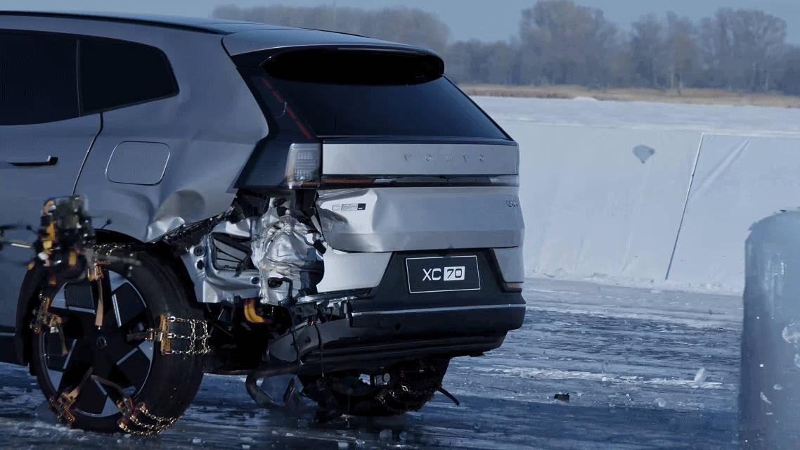 6.5吨无溃缩实心冰壶、-30℃极寒环境、多次随机连环撞击,碰撞能量远超国标常规双车测试,几乎所有冲击全靠XC70车身独自硬扛。