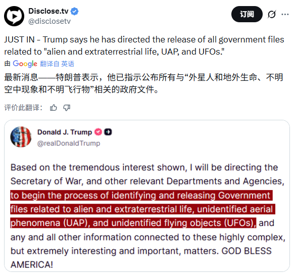 外星人真的存在?特朗普称将指示五角大楼启动UFO文件公开程序海外新鲜事ai热点共