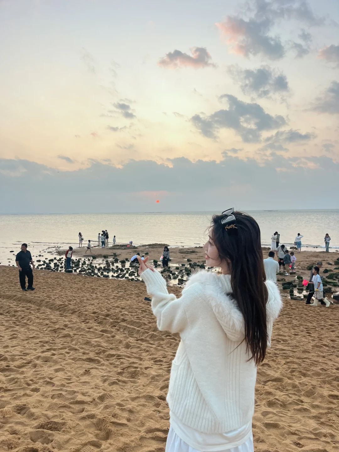 跟爸爸妈妈一起在海口过年 终于拍照啦 去了荣山寮海滩 人好多啊 还想跳个舞呢 下午六点左右 大太阳突然没了 就换了身衣服拍照就暗了 但是蹲到了夕阳 感觉拍照的话还是不要来这个海滩 不如云洞图书馆好看