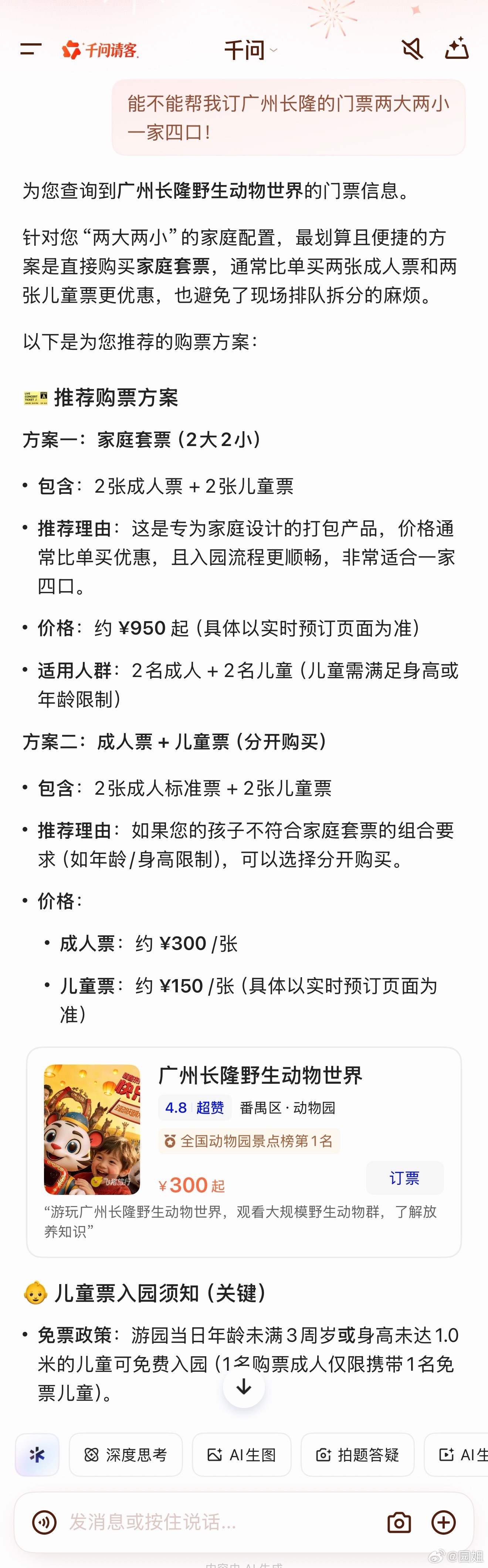 最近千问的奶茶没白喝,我发现假期出行千问也有点东西,这几天不是带孩子在广东玩吗,以前要各种翻攻略做功课,现在方便多了,告诉千问你的需求,它就能帮忙做出行攻略,还能帮忙订景点门票,很方便!除此之外还可以帮忙订电影票等等,还真是解决了大家都日常餐饮,娱乐和出行需求~