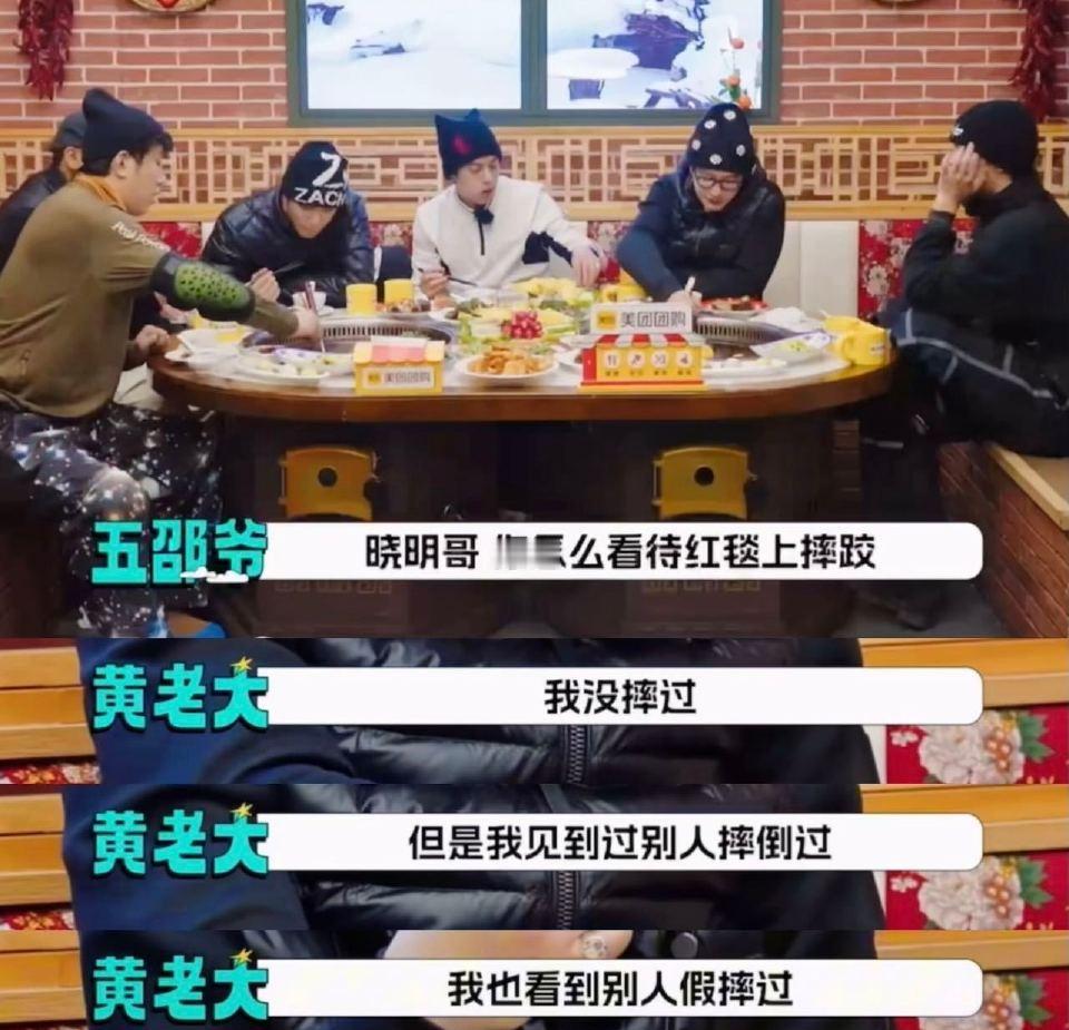 黄晓明又来曝料了,2月21日,黄晓明和王鹤棣黄子韬吃饭时突然聊到摔跤这个话题,黄晓明说我见过在红毯上故意摔倒的,就是为了有话题。 黄晓明先是说自己没有摔过,但他见过别人在红毯上摔倒的,有真的不小心摔倒的,也有是自己假摔的,至于是谁黄晓明并没有直接说出名字。 为了博话题在红毯上假摔的,应该是那些快没戏拍的明星,一般像当红明星哪个会愿意在红毯上假摔,人家不缺话题和流量,还有万一假摔被发现了,对他们来说也是得不偿失。 所以那些假摔的肯定不是一些当红明星,就算是摔了也是不小心摔倒的,就像孟子义和李昀锐星光大赏上台那次摔倒肯定就不是假摔,她没必要这么做。