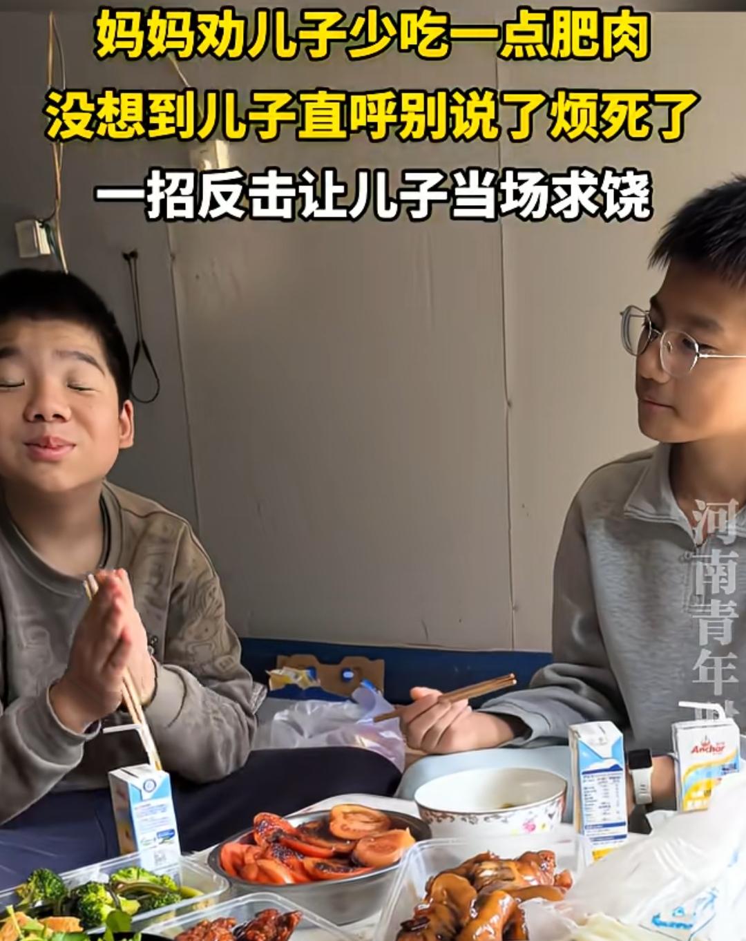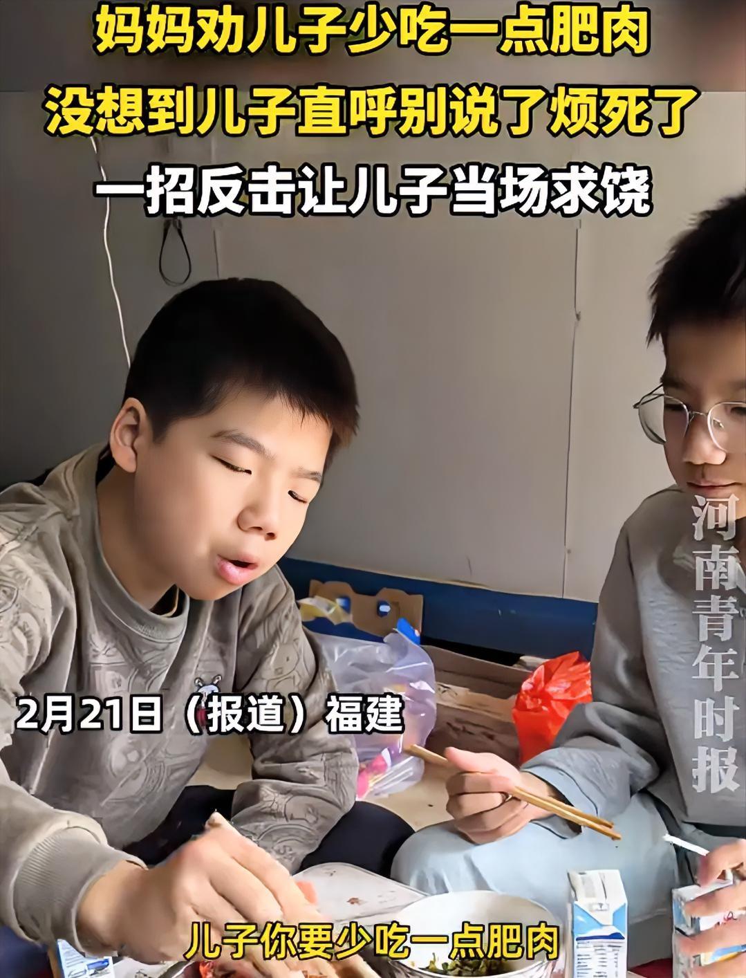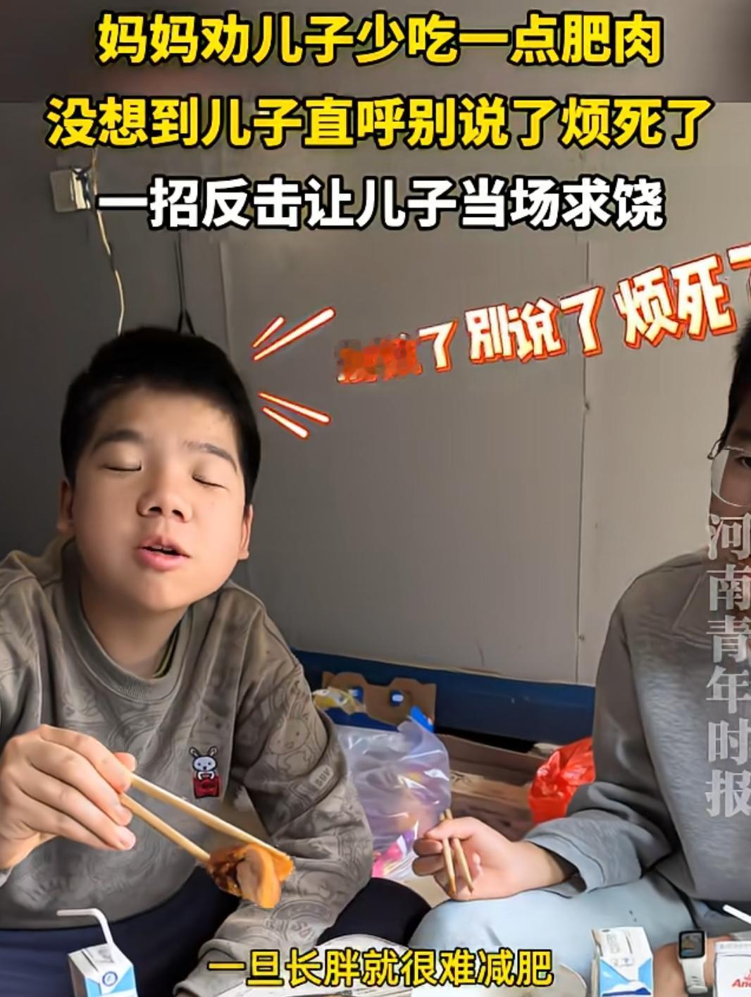 这是不求孩子快乐的长大,只求孩子愧疚的活着?这母亲真让人下头! 福建,一妈妈在吃饭的时候,劝儿子少吃一点肥肉,解释的理由还没说完。就被儿子打断,直呼别说了烦死了。没想到,女子直接唱起歌来。 《百善孝为先》刚唱第一句“是谁把你带到人世间”,儿子立刻放下肥肉,直接投降,双手拜托拜托,只求妈妈放过自己。 母亲用心是好的,肥肉吃多了,对身体确实不好。儿子的态度也着实过分了,大人话还没说完,直接就打断,很没教养。 但这种愧疚式教育,跟道德绑架有啥区别,而且是极致过度的那种。看情形,这一幕经常上演,母亲这招都成“紧箍咒”,信手拈来。 如果母亲觉得这道菜不合适孩子食用,肥肉太多,与其苦口婆心劝诫孩子,还不如不买,直接从源头解决问题。 孩子健康成长,本应是在理解和尊重的环境中。而这位母亲用愧疚式教育方式,短期内看似有效,实则是对孩子心灵的“慢性伤害”。心理有枷锁的孩子,怎么可能快乐成长? 希望家长们都能摒弃这种教育方式,让孩子在真正健康、温暖的环境中长大。