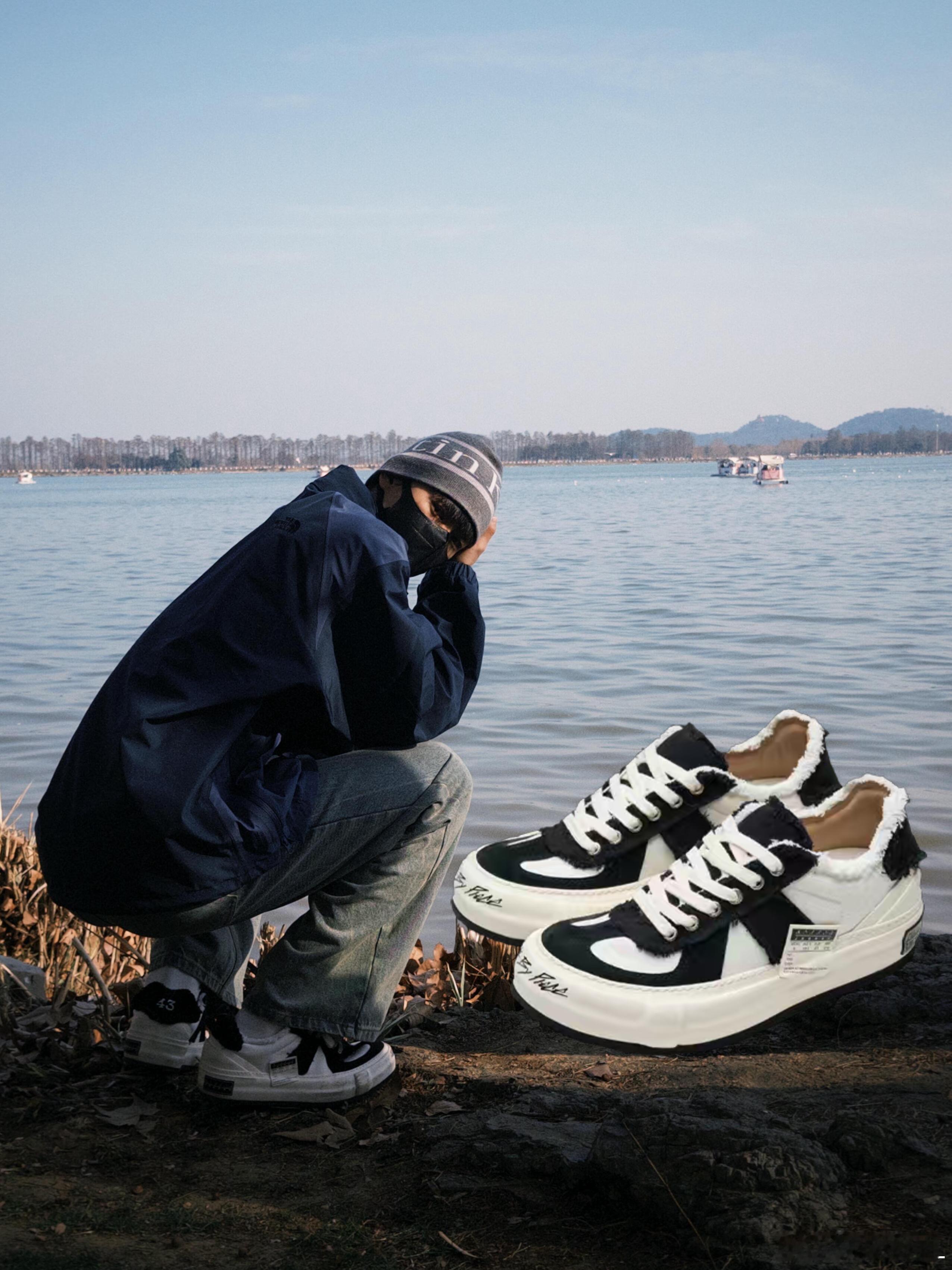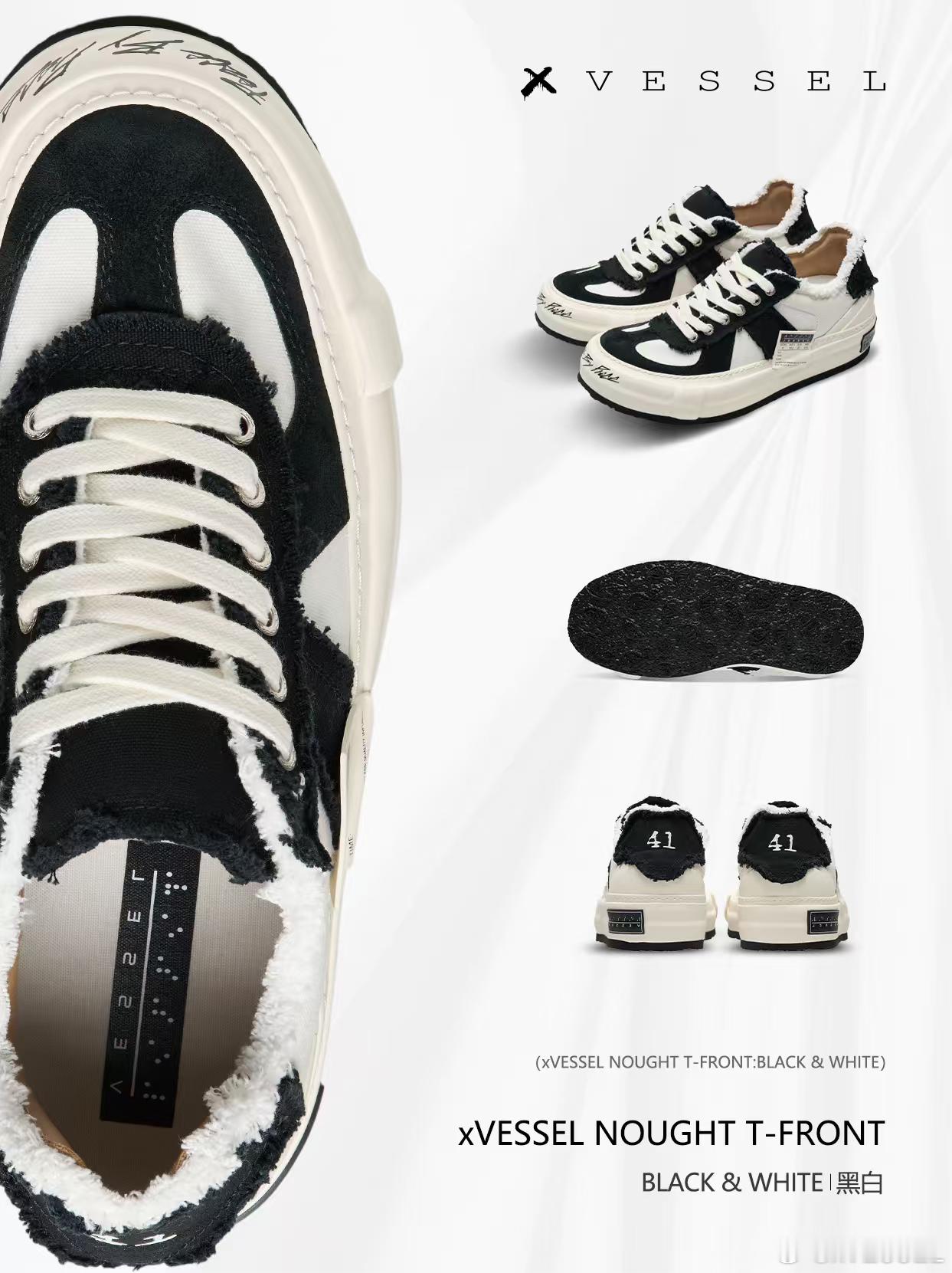 上脚 【xVESSEL Nought T-Front黑尾德训】短绒反毛皮拼接帆布的经典熊猫配色,5cm隐形增高结合浮雕腰果花大底,显腿长的同时带来踩屎级舒适体验