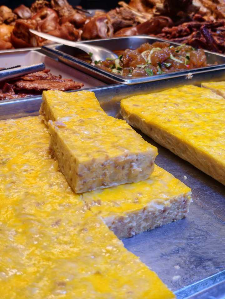 虫虫:你吃过咸咸的马蹄糕吗?!就在漳州的菜市场里,老板切了块给我们尝尝,味道真不错。鲜肉的醇香和马蹄的爽口结合的很完美。甚至还有皮蛋馅的呢?