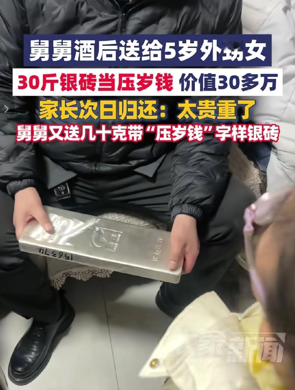 豪横!山东临沂硬核拜年,5岁外甥女一磕头,舅舅竟当场送出30斤重、价值30多万的大银砖当压岁钱!父母怕太贵重第二天归还,舅舅不死心,再送一块精致小银砖,价值1000多,这才皆大欢喜!这才是过年最实在的宠爱! 2026年春节,山东临沂一户普通人家,屋里暖意融融,年味十足。 茶几上摆着糖果、瓜子、水果,大人围坐说笑,孩子跑来跑去,到处是过年才有的热闹与踏实。 5岁的小外甥女穿着一身红彤彤的新年装,棉袄上绣着吉祥图案,小脸蛋冻得粉嘟嘟,眼睛又黑又亮。 被妈妈牵到舅舅面前时,她一点不怯生,小身子站得笔直,小手乖乖贴在腿边。 在家人温柔的提醒下,小姑娘认认真真弯下膝盖, “咚”地轻轻磕了一个头, 小奶音又软又甜,清清楚楚喊: “舅舅新年好!恭喜发财!” 那模样乖巧、认真、又充满童真, 在场所有人的心,瞬间被萌化、暖化。 谁也没料到,这个头磕下去,直接磕出一个全场震撼。 舅舅本就喝了点酒,脸上带着笑意,心里正热乎, 看见外甥女这么乖、这么懂事,当场豪气上头,说到做到。 他起身转身,从一旁稳稳抱出一块超大银砖。 银砖通体发亮,沉甸甸、厚实实, 足足30斤重,成年人抱在怀里都要沉得往下坠。 现场懂行的亲戚一眼算出: 这块银砖,价值30多万元。 舅舅把银砖“咚”地稳稳放在桌上, 大手一挥,指着外甥女,语气又认真又霸气: “这是舅舅给你的压岁钱!说话算话!” 那一刻,整个屋子瞬间安静。 所有人都愣住、看呆、瞪大眼睛。 这哪里是压岁钱? 这是把实打实的家底,掏出来疼外甥女! 亲戚们先是震惊,随即爆发出阵阵惊呼与笑声: “我的天,这舅舅也太宠了!” “头一回见这么给压岁钱的!” 孩子爸妈当场就慌了神,心里又暖又急。 他们知道舅舅是真心疼孩子,可这礼太重、太贵重了。 别说一个5岁孩子,就是大人也万万不能收。 他们当场反复推辞,可舅舅态度坚决,一门心思就要给,怎么劝都不肯收回。 实在拗不过,夫妻俩第二天一早, 就原封不动、完完整整,把这块30斤的大银砖送回舅舅家。 他们不是不领情,不是见外, 是真的懂: 亲情再亲,也不能被这么重的金钱压着。 领的是心意,不是钱财。 本以为这件事就到此为止, 可谁都没料到,舅舅的宠爱,根本停不下来。 见大银砖被退回,他一点不生气,也不尴尬, 只是心里不落忍: 我想疼外甥女,总得让我疼到啊。 他悄悄琢磨了一晚上, 专门去准备了一份更用心、更合适、更有年味的礼物: 一块小巧精致、专门刻着**“压岁钱”**三个大字的小银砖。 不大、不重、不夸张,价值一千多元, 有仪式感,有分量,又不失分寸。 这一次,礼物刚刚好。 有心,有度,有疼爱,有边界。 孩子爸妈看着舅舅这份不放弃的真心, 再也推辞不掉,笑着、感动着收下。 一大家子围在一起,笑得合不拢嘴,和和气气,圆满又暖心。 有人宠是惊喜,懂得退让是体面; 舍得给是真心,知道收放是智慧。 不贪不占,不欠不怨, 不因为钱多而生分, 不因为客气而凉了真心。 有钱是一回事,真心是另一回事。 愿意为你豪横,也愿意为你收敛。 既舍得倾尽所有去疼, 又懂得守住边界去爱。 这样踏实、温暖、通透、有分寸的亲情,才是这个新年里,最珍贵、最让人羡慕的礼物。