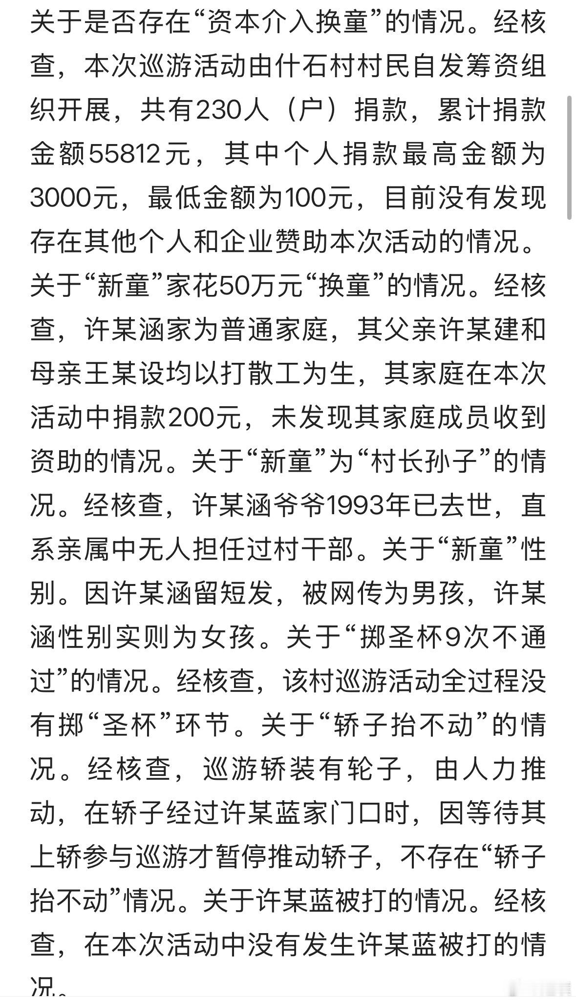 1、网传男孩是假,实际是个10岁短发女童2、花50万元换人是假,女童父母捐款金额为200元,也不是村长孙子。2、掷圣杯9次不通过是假,巡游活动全过程没有掷“圣杯”环节。3、轿子抬不动是假,巡游轿装有轮子,因等待其“小妈祖”上轿参与巡游才暂停。4、网传小妈祖被打也是假的。