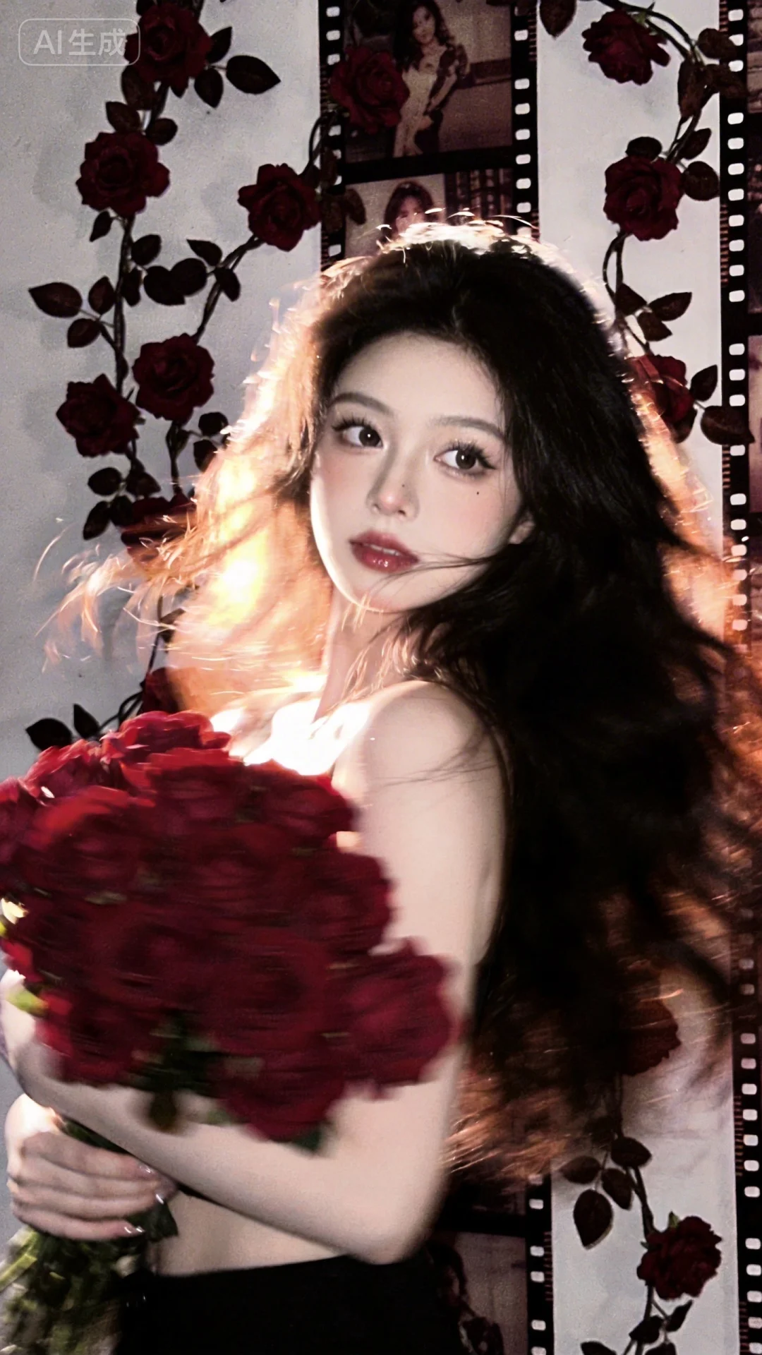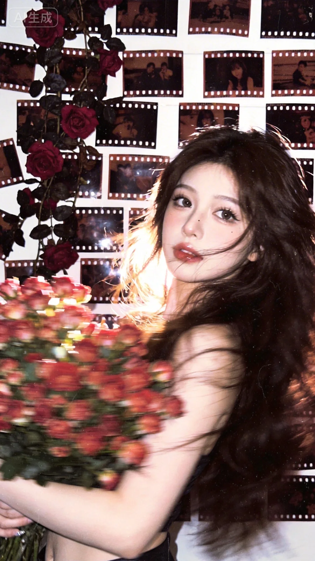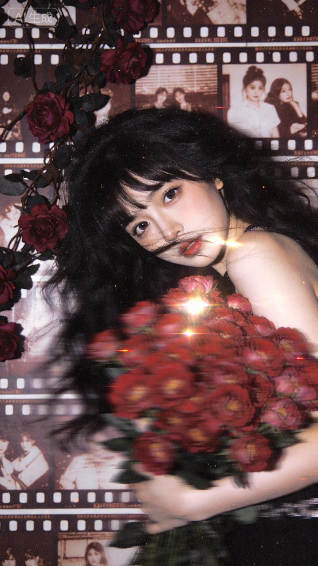 铺着复古老电影胶片切片的老照相馆背景旁爬满酒红花簇与墨棕藤蔓,复古CCD质感裹着粗粝颗粒,虚焦背景叠加重影拖影,残迹般的光影晕染出非现实主义氛围。携清风的妖冶美少女侧身抱巨大花束,冷白皮透着细腻光泽,五官精致立体,纯欲慵懒气质尽显,娃娃脸搭配美颜全开的精致妆容,磨皮效果下聚焦脸部特写,绝美大眼灵动有神,萌妹可爱的ins风十足,蓬松长发随性散落,上半身特写尽显慵懒舒展,酷甜辣妹风融合清冷钓系,轮廓平移间,动感模糊覆于面容更添朦胧感,柔焦弱化边缘强化松弛感。低饱和红棕调滤镜笼罩,自带柔光的长发逆光飘散,发光发丝轻扫下颌,凌乱飘动间藏着细节里的吸引力,表情灵动又带妖冶感,运动模糊与CCD颗粒交织,网感十足,朦胧画面勾勒出满是故事感的氛围感头像动感场景。