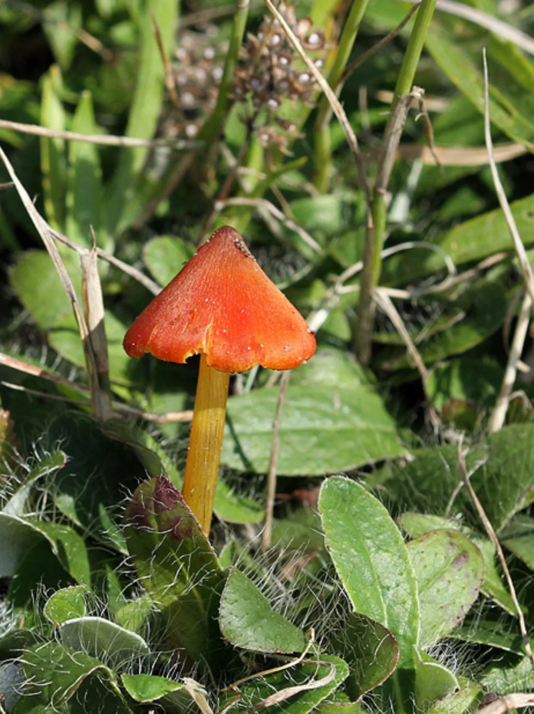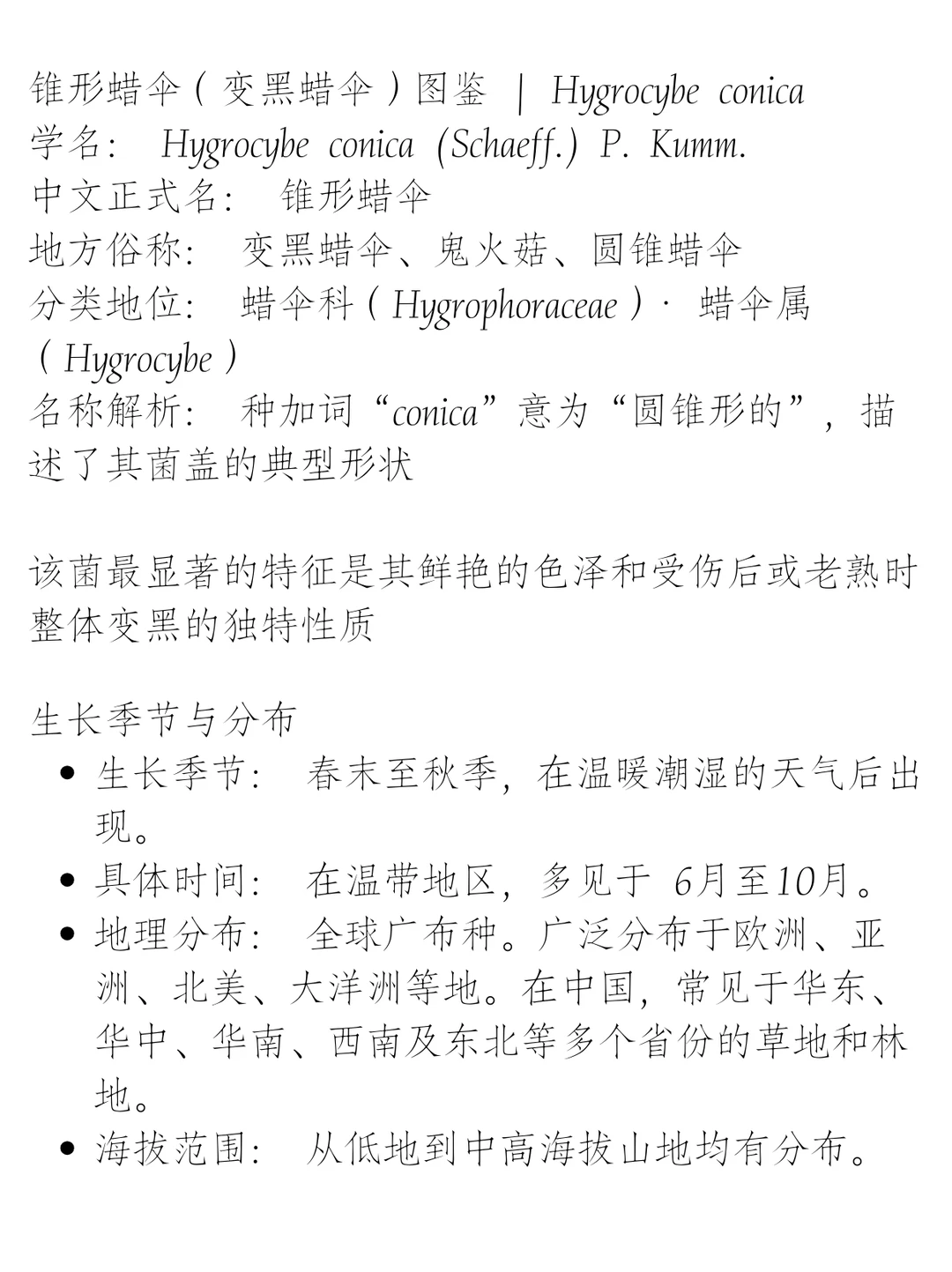 蘑菇爱好者 捡菌子 野生菌 蘑菇 植物科普 蘑菇竟然那么美 奇妙大自然 学名: Hygrocybe conica (Schaeff.) P. Kumm. 中文正式名: 锥形蜡伞 地方俗称: 变黑蜡伞、鬼火菇、圆锥蜡伞 分类地位: 蜡伞科(Hygrophoraceae)· 蜡伞属(Hygrocybe)名称解析: 种加词“conica”意为“圆锥形的”,描述了其菌盖的典型形状。