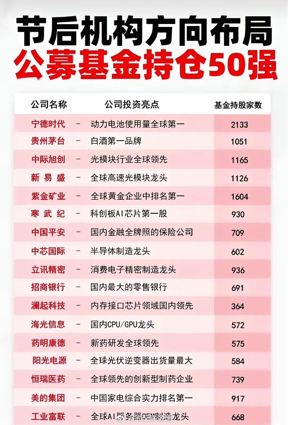机构重仓50强曝光!核心赛道龙头全名单,资金抱团方向一目了然。公募基金持仓50强名单出炉:从超算龙头中科曙光到AI芯片寒武纪,从白酒龙头贵州茅台到动力电池宁德时代,机构资金持续向高景气赛道与核心资产集中,节后布局方向清晰可辨!公募基金重仓的科技龙头代表:寒武纪、中际旭创、中兴通讯、中科曙光、兆易创新等等。50强名单中私募基金超千家持仓的公司有5个!本文内容仅为信息分享与市场分析,不构成任何投资建议、投资分析意见或交易依据。市场有风险,投资需谨慎。相关标的仅为案例展示,不代表推荐,投资者应独立决策、自负盈亏,切勿盲目跟风操作。