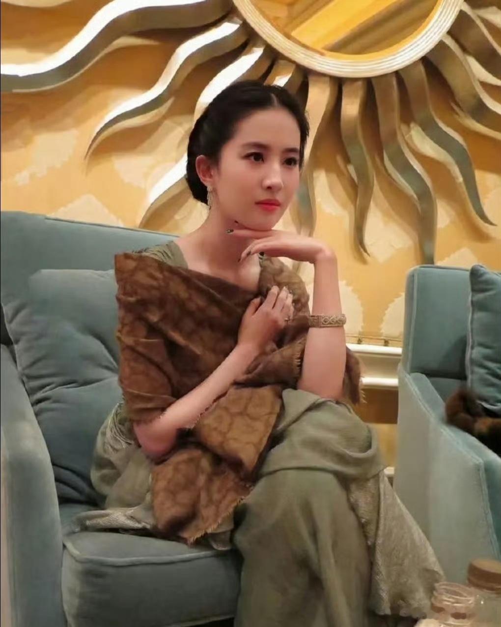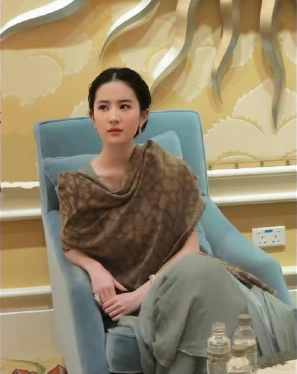 刘亦菲这次内搭灰绿色丝质长裙,面料垂坠光泽感十足,低圆领设计尽显温婉。外搭棕色提花羊绒披肩,暗纹图案与暖棕色调提升贵气,中和了轻盈感,层次丰富。