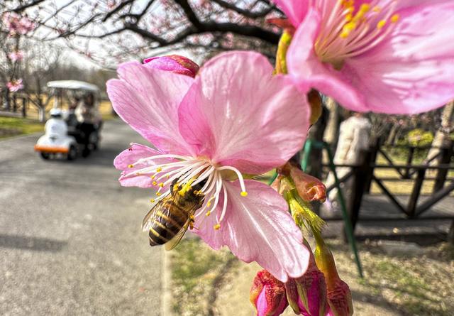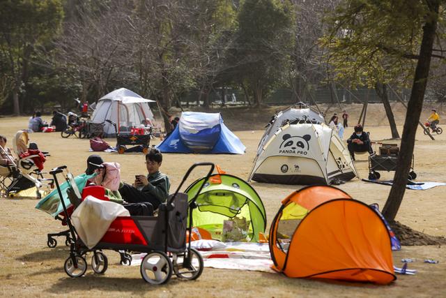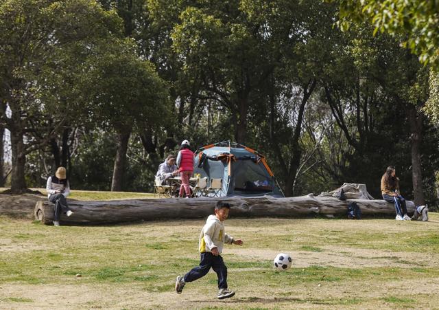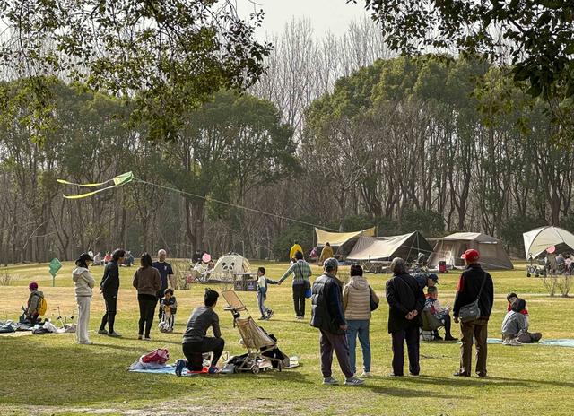 顾村公园人气聚集。樱花林中,大渔樱、钟花樱等早樱品种在气温催化下悄然绽放,粉白花瓣缀满枝头,景致清新雅致,吸引游客驻足拍照。园区游乐园里,家长带着小朋友尽情游玩,欢声笑语此起彼伏;大片草坪上支起了成片的露营帐篷,市民围坐其间闲谈休憩,沉浸式亲近自然,享受假日的惬意时光。