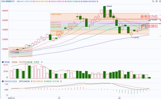 从盘面观察,碳酸锂主力合约LC2605今日开盘向上跳空,一举站上短期所有主流均线,站稳于前期缺口之上(1月12日最低价),且资金也呈现小幅回流迹象,MACD指标有望在零轴上方形成金叉。上方关键压力位参考1月13日最低价161,540元附近,支撑参考2月13日最高价146,920元附近,在下方短线支撑未失守前,技术上短期碳酸锂或有望震荡偏强运行。