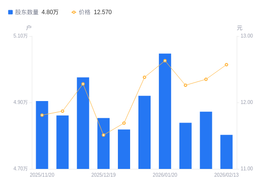 日期A股户数(户)流通A股户均持股数(股)户均持股市值(万元)2026-02-134802617297.3121.742026-02-104872517028.2421.032026-01-304838817146.8321.022026-01-205047316438.5120.762026-01-094920116863.5020.882025-12-314818817218.0020.132025-12-194853317095.6019.682025-12-104975816674.7320.482025-11-284861117068.1720.262025-11-204904316917.8319.98