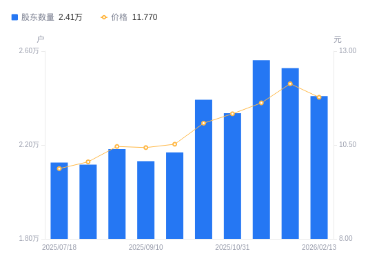 日期A股户数(户)流通A股户均持股数(股)户均持股市值(万元)2026-02-132408224482.1328.822026-01-302527123330.2428.302025-11-282561123020.5226.752025-10-312335325246.3728.602025-10-202392624641.7527.302025-09-302168127193.3328.612025-09-102131127665.4628.862025-08-202182427015.1528.262025-07-312115927864.2028.002025-07-182125227742.2627.38
