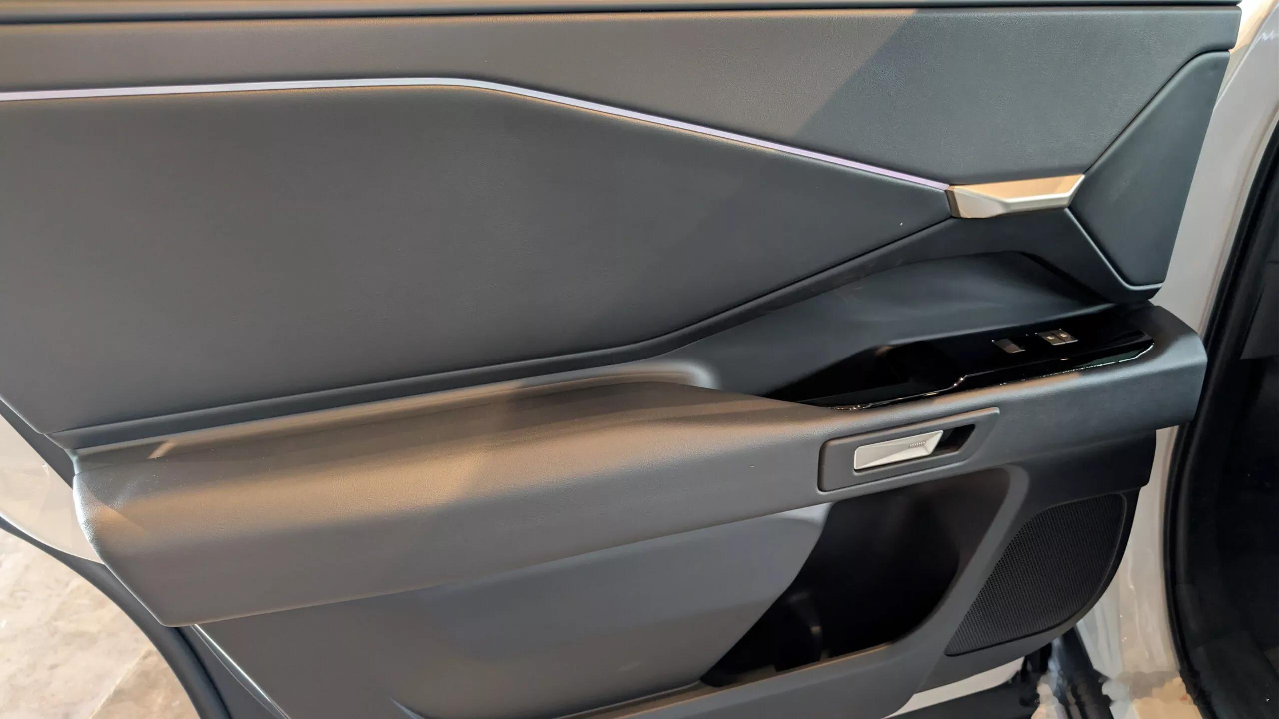 纯电汉兰达的内开门按键,按压电动开启,扣动机械开启外门把手内侧靠后有一个可见的机