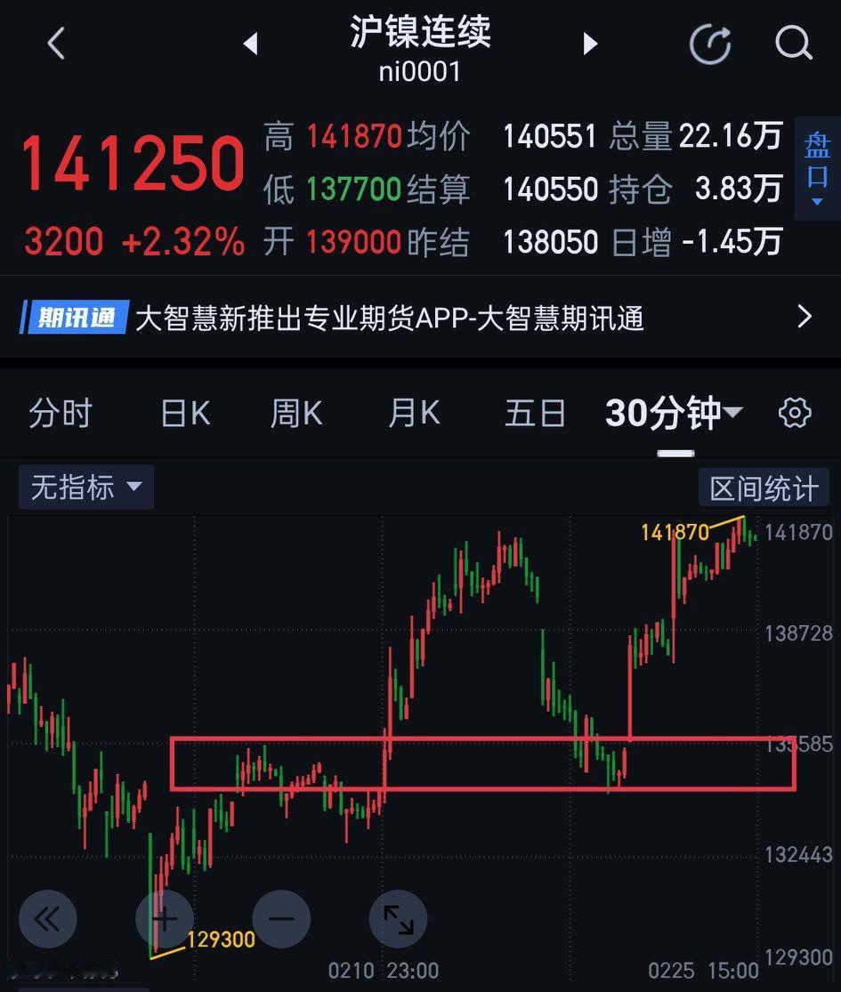 沪镍,今天日K收线还算漂亮。夜盘可观察围绕图〈1〉的一分钟中枢是否形成三买点。如三买形成,继续用移动止盈去跟随上涨,后续沪镍有望挑战阶段高点152300。如不能形成三买,今天的高点141870可做为一分钟中枢的背驰点,引发三十分钟一笔下的回调。日线图上积极的一面,从129300开始的日线一笔上已经形成,后期只要图〈3〉的五分钟级别中枢不被有效破坏,该笔日线上的结构将会继续保持。