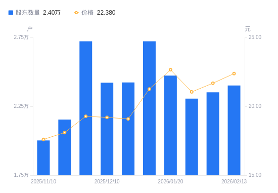 日期A股户数(户)流通A股户均持股数(股)户均持股市值(万元)2026-02-13240148790.1519.672026-02-10235188975.5419.462026-01-30230609153.8119.272026-01-20247388532.9019.342026-01-09272217754.5616.492025-12-19242398708.5616.622025-12-10242158717.1916.742025-11-28272227754.2714.952025-11-20215439798.3917.742025-11-102002810539.5818.55