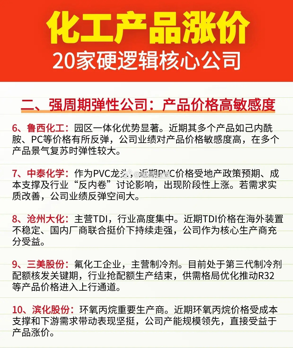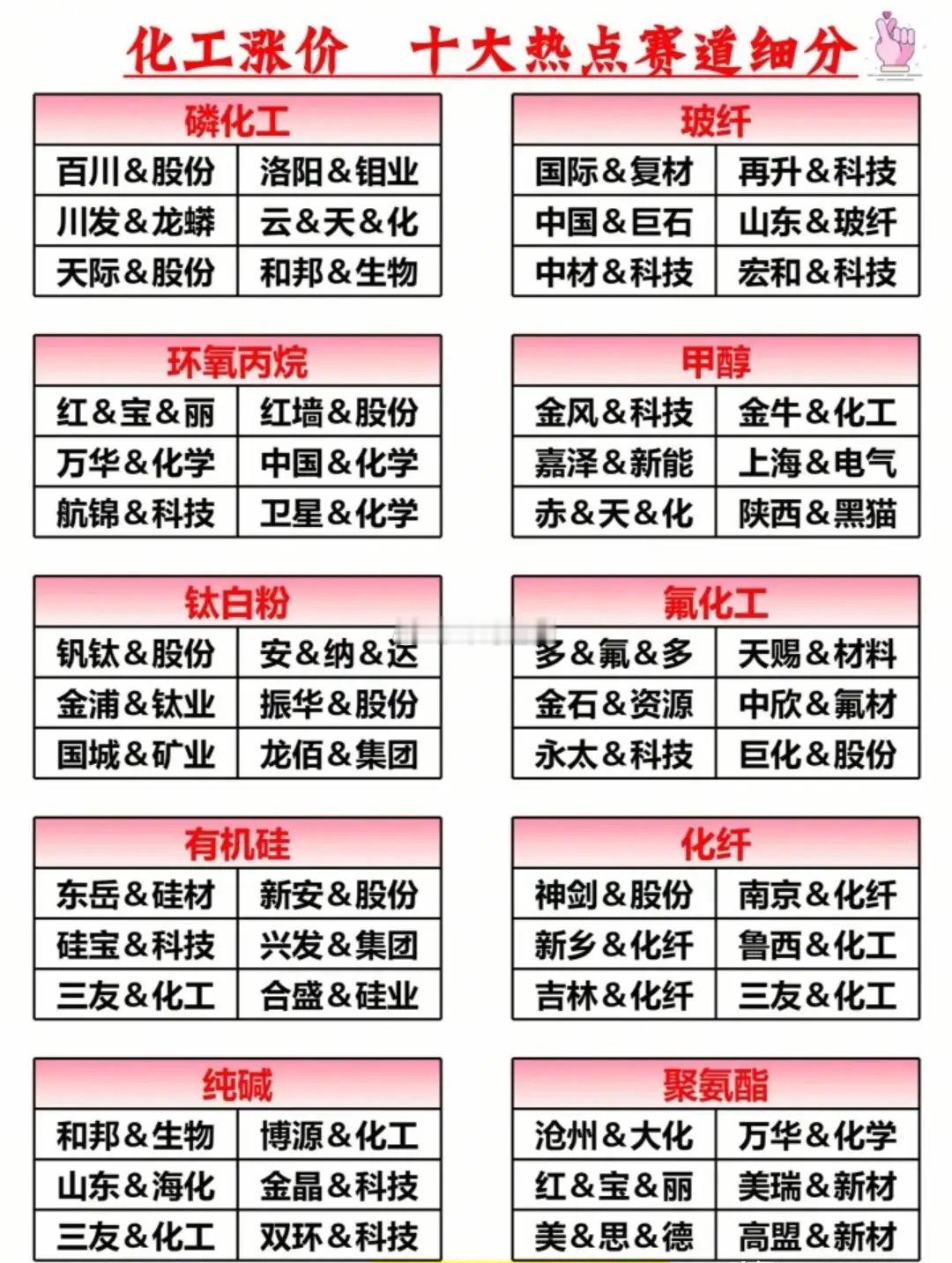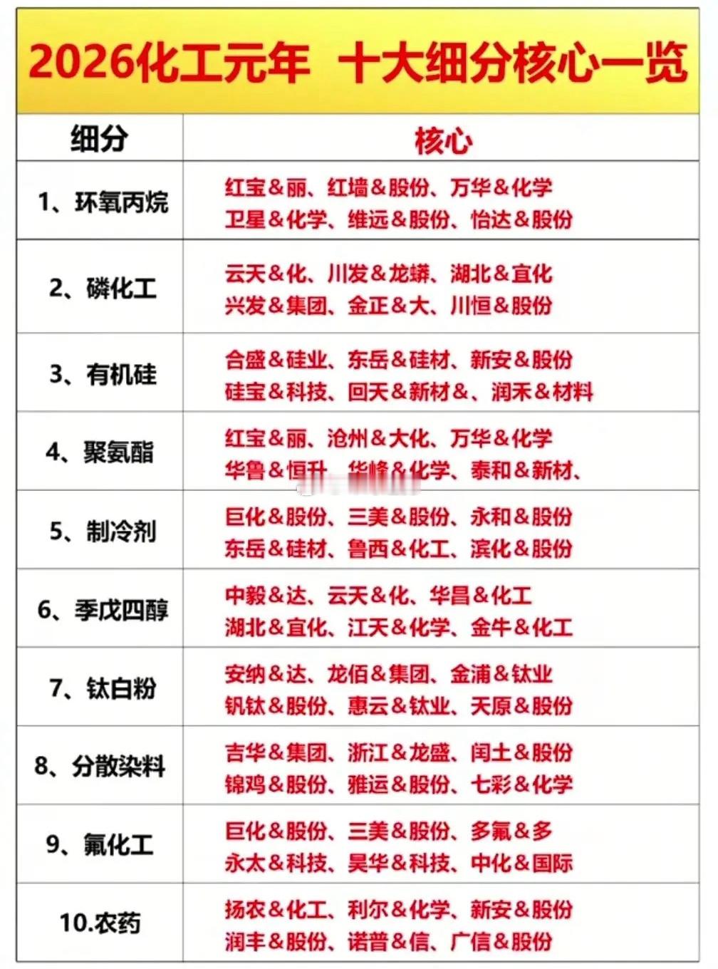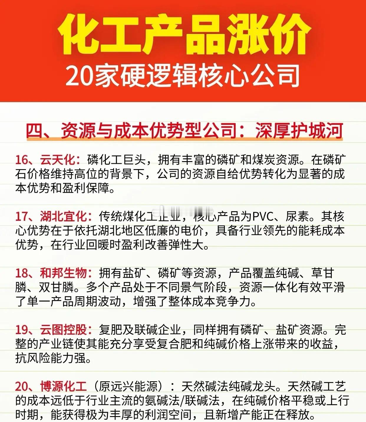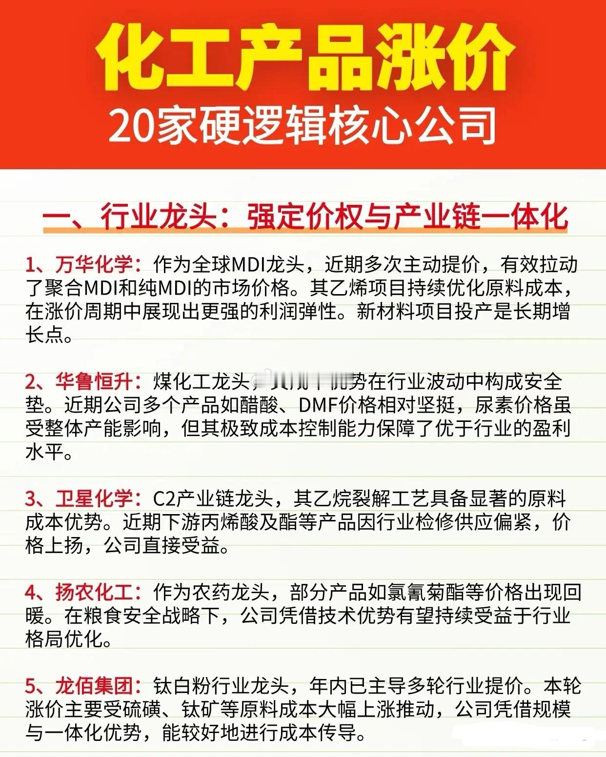 稀缺!化工涨价潮中,只有这20家公司拥有“印钞权”!化工产品涨价潮来袭!20家硬逻辑核心公司,从行业龙头、强周期弹性股、细分冠军到资源成本优势企业,全产业链覆盖,精准把握涨价红利,掘金化工赛道核心机会!化工概念绝对核心龙头代表:万华化学全球MDI第一、华鲁恒升煤化工龙头、 新洋丰磷复肥龙头、云天化磷化工巨头、中泰化学PVC龙头、扬农化工农药龙头、卫星化学C2产业链龙头……~2026化工元年,涨价潮已至!磷化工、玻纤、有机硅、钛白粉、聚氨酯等十大细分赛道全线爆发,各细分核心标的蓄势待发,精准把握产业链红利,掘金化工黄金赛道!理财有风险入市需谨慎!化工行业化工周期股化工指数A股