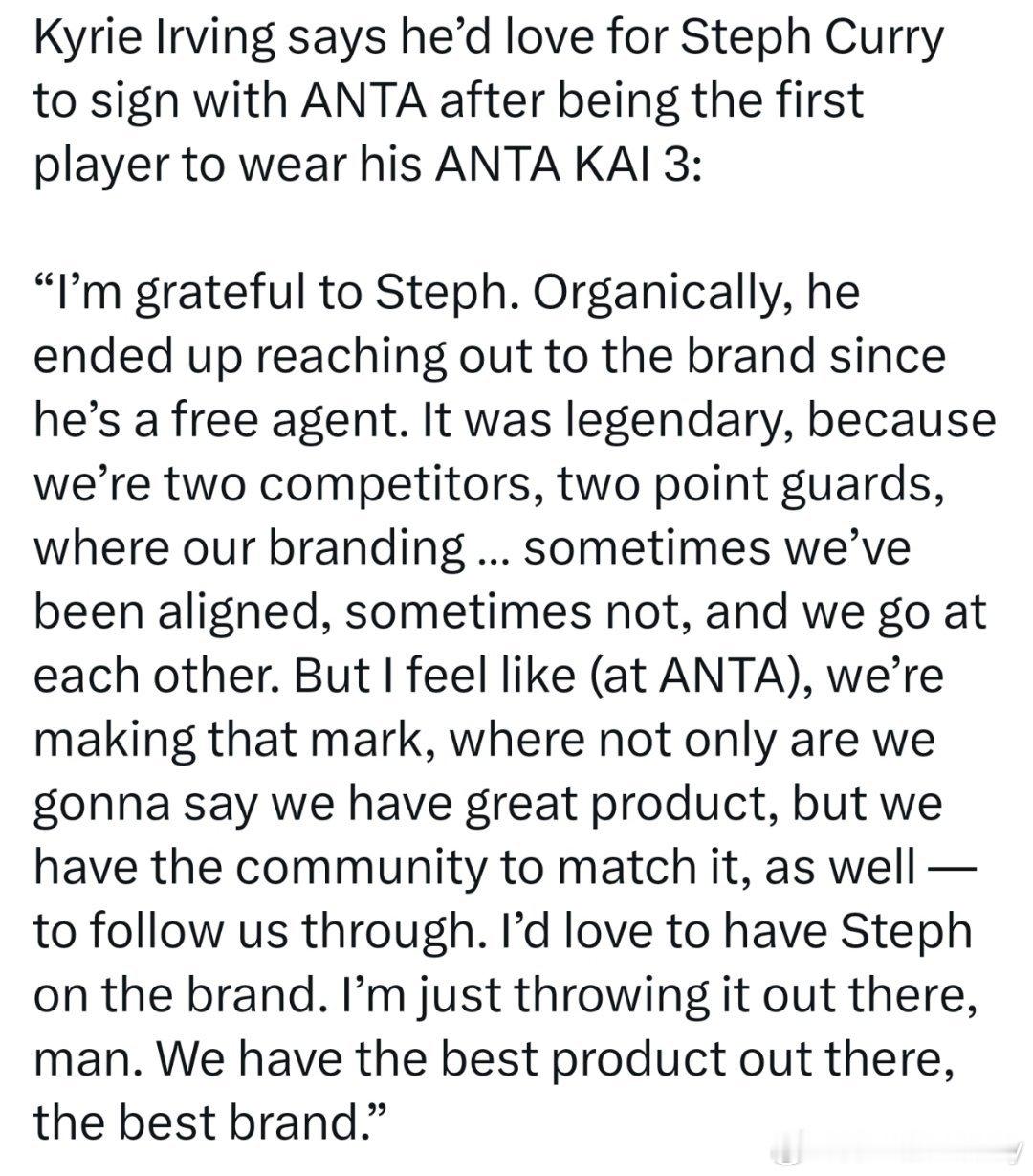 但我觉得(在ANTA),我们正在打造属于自己的印记,不仅是说我们有很棒的产品,还有与之相匹配的社群——跟着我们一起走。我很希望斯蒂芬能加入这个品牌。我就是随便说说,兄弟。我们有市场上最好的产品、最好的品牌。”