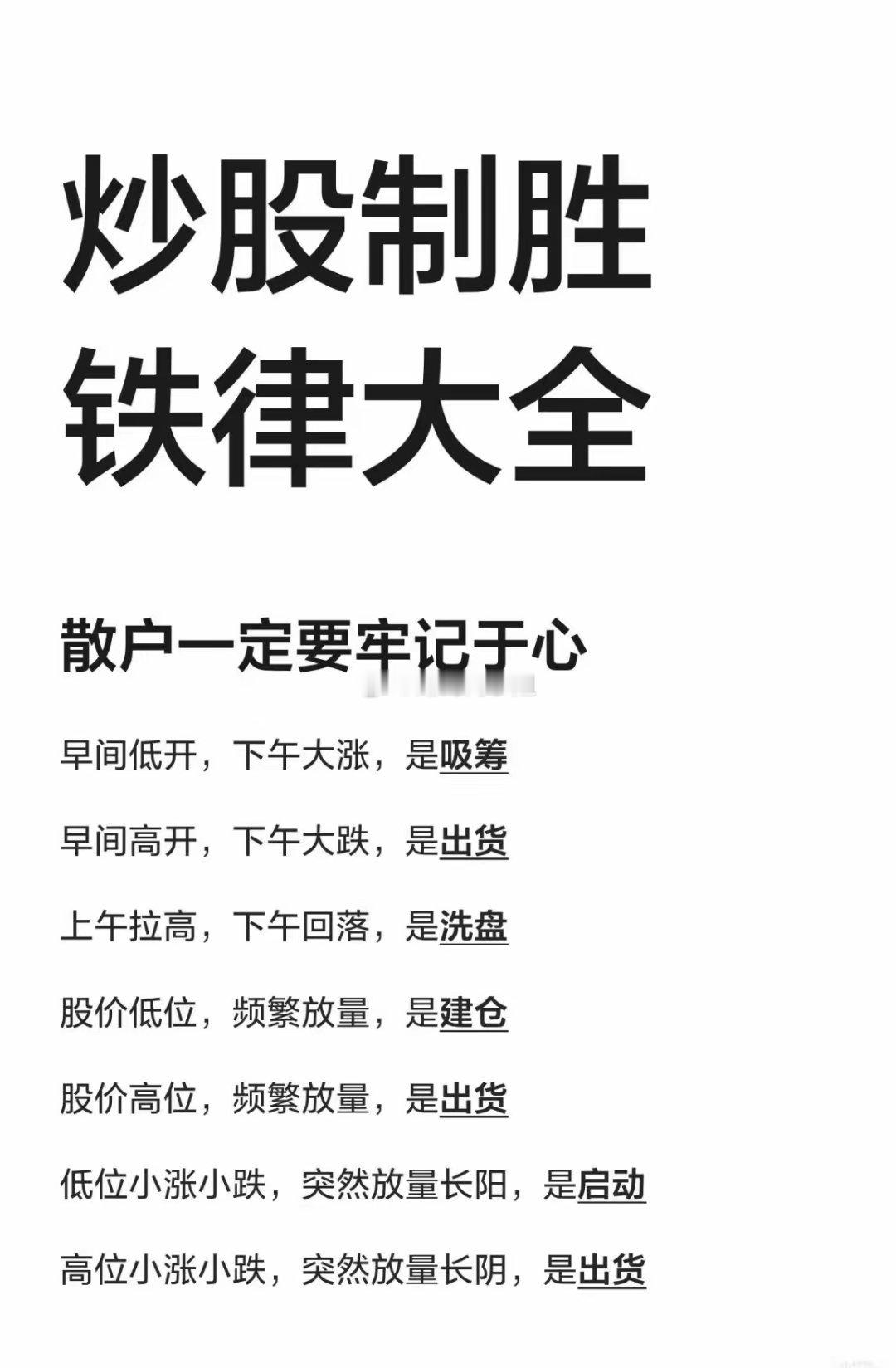 1. 炒股从不是凭感觉博弈,这些制胜铁律,藏着主力资金的动作密码。读懂分时走势的强弱信号,看清量价背后的筹码逻辑,散户才能在复杂的市场里,少走弯路,精准避坑。2. 量价与分时的博弈,从来都有迹可循。这七条炒股铁律,道破了吸筹、出货、洗盘的核心信号。牢记于心,理性判断,才能不被市场情绪裹挟,守住属于自己的收益。