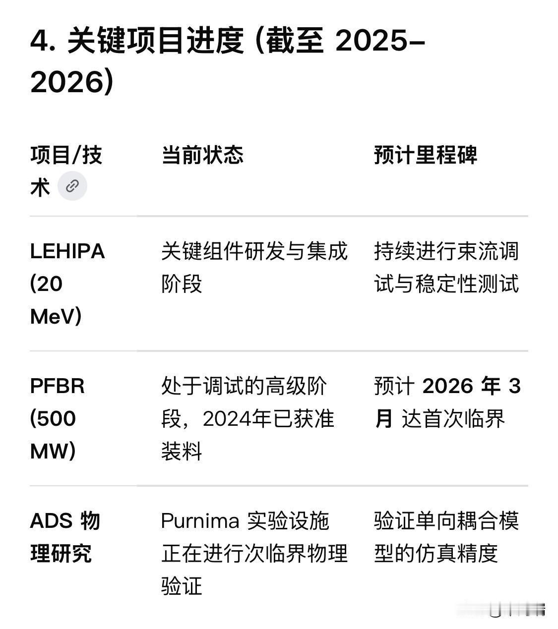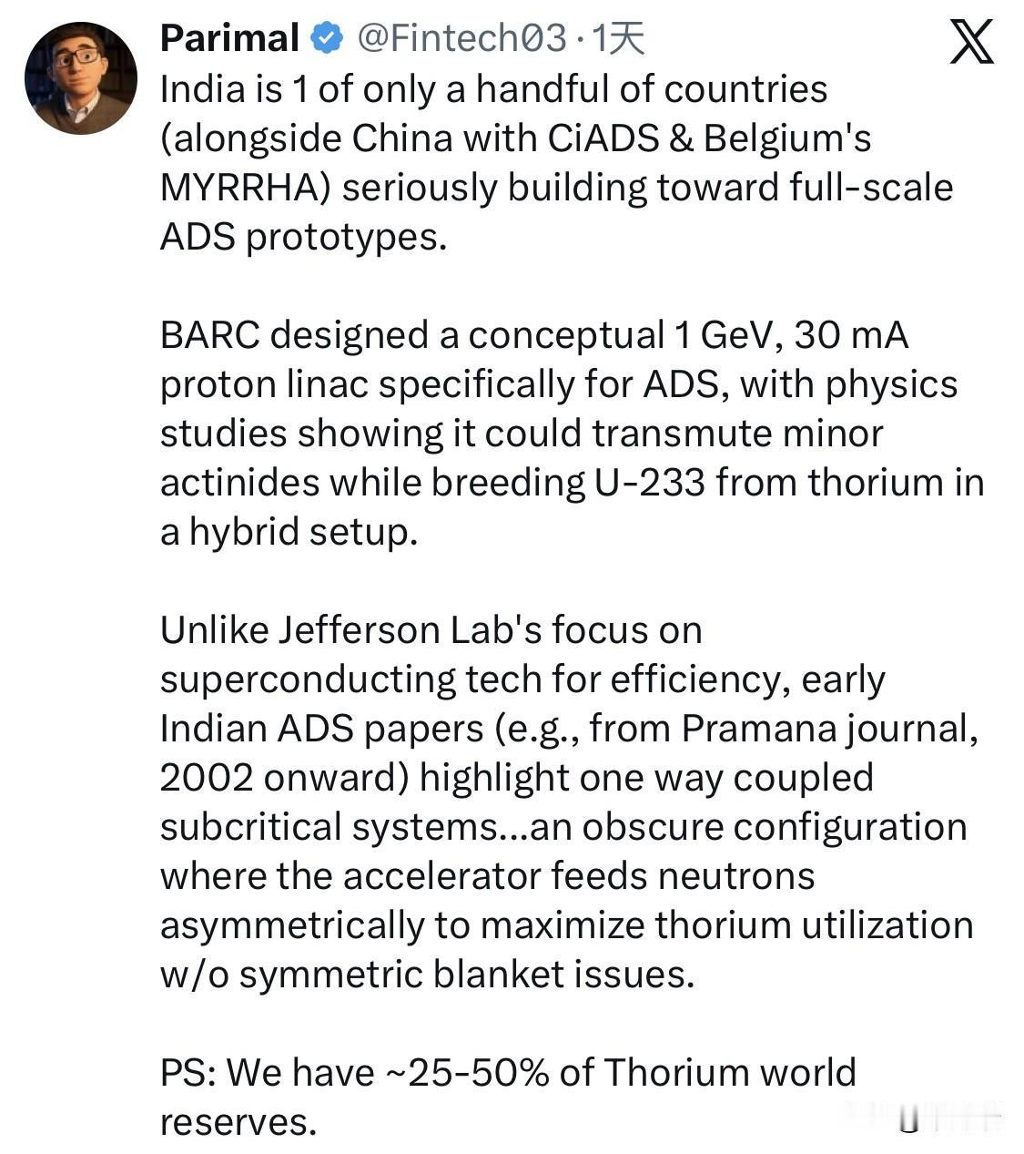 印度在加速器驱动系统(ADS)领域的布局确实具有高度的前瞻性,尤其是将其作为实现其“三阶段核能计划”中第三阶段(大规模利用钍)的关键跳板。 关于印度 ADS 原型机及相关技术发展的最新状态: 1. 核心加速器:LEHIPA 与 1 GeV 蓝图 巴芭原子研究中心(BARC)设计的 1 GeV, 30 mA 质子直线加速器 是印度 ADS 计划的心脏。 分阶段开发: 印度采取了分步走的策略。目前的核心任务是完成低能高强度质子加速器 (LEHIPA)。这是一个 20 MeV 的前端注入器,旨在解决高流强下的空间电荷效应挑战。 技术路径: 与 Jefferson 实验室等强调极高加速梯度的超导实验室不同,BARC 的方案在 100 MeV 以下主要采用常温结构,100 MeV 以上则转向超导椭圆腔技术。 2. “单向耦合”次临界系统:印度的独特创新 你提到的单向耦合(One-way Coupling)配置是印度在 21 世纪初(如 2002 年发表于 Pramana 期刊 的研究)提出的核心概念。 级联增殖: 该系统通过一个快速中子内芯(产生中子)耦合一个热中子外芯(进行乘殖)。 不对称性优势: 这种设计允许中子从内芯流向外芯进行放大,但通过吸收层和几何设计阻止中子反向流动。这极大地降低了对加速器束流电流的要求(从 30 mA 降至更低的水平),从而缓解了加速器运行的负担。 钍的高效利用: 该配置旨在不依赖传统对称包层的情况下,最大限度地提高钍-232 向铀-233 的转化率。 3. 全球钍储量背景 储量占比: 根据 美国地质调查局 (USGS) 及相关机构的评估,印度拥有全球约 25% 至 50% 的钍储量。 战略意义: 这种丰厚的自然资源是印度坚持独立研发 ADS 和 原型快堆 (PFBR) 的根本动力。