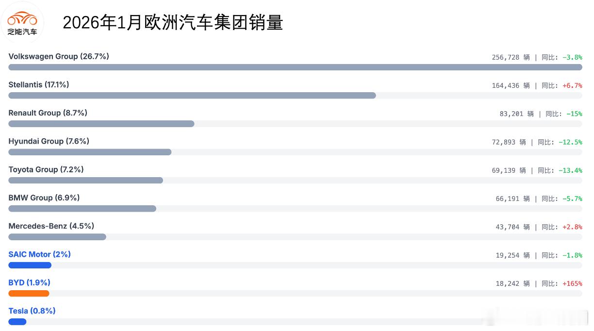 2026 年 1 月欧洲车市整体小幅回落,德法意西仍是核心市场。电动化稳步推进,纯电与插混保持增长,混动依旧是当地最主流的选择,区域格局相对稳定。