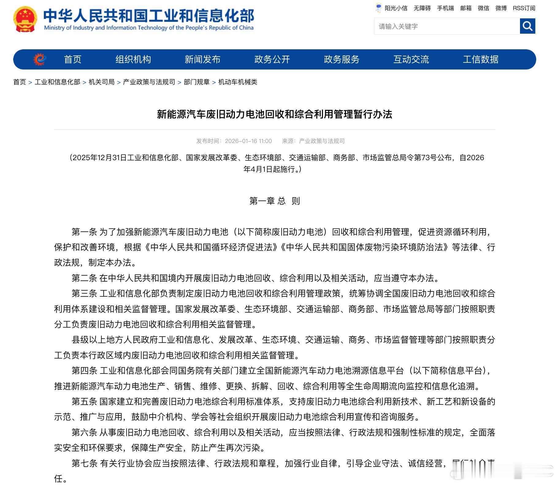 工信部等6部门推出的《新能源汽车废旧动力电池回收和综合利用管理暂行办法》即将在今年4月1日落地。