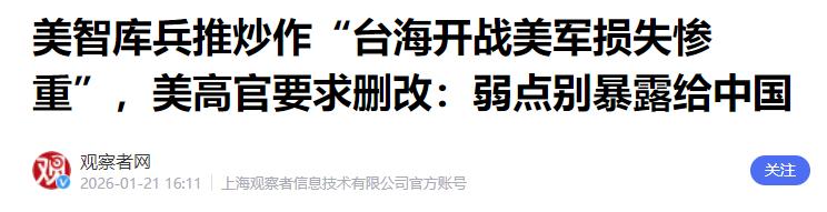 观察者网:美智库兵推炒作“台海开战美军损失惨重”,美高官要求删改:弱点别暴露给中国
