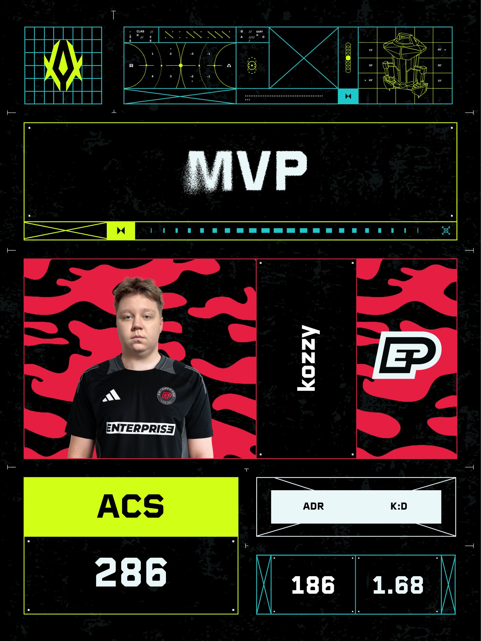 EnterpriseEsports在本次赛事A组的旅程:1-2vsStallionsEsports、2-0vsKC、2-0vsJoblife、2-1vsGX、2-0vsFUT,一共击败三支VCT队伍完成夺冠,而kozzy获得MVP。